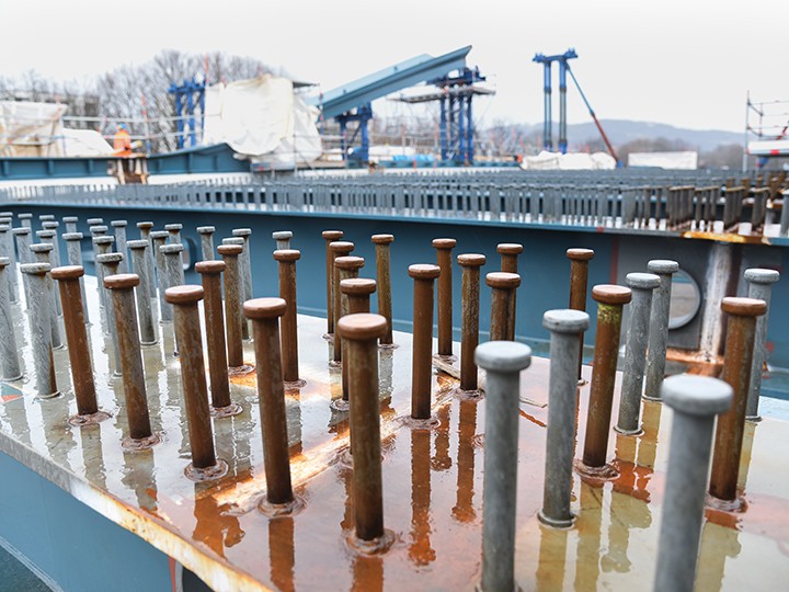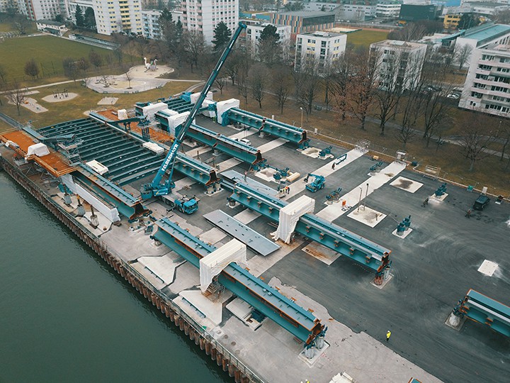 Dicht an dicht liegen die Stahlteile am Donauufer und werden Schritt für Schritt zusammengefügt.
