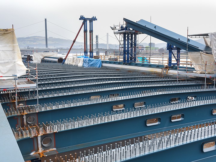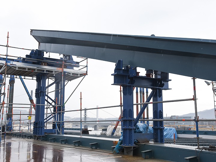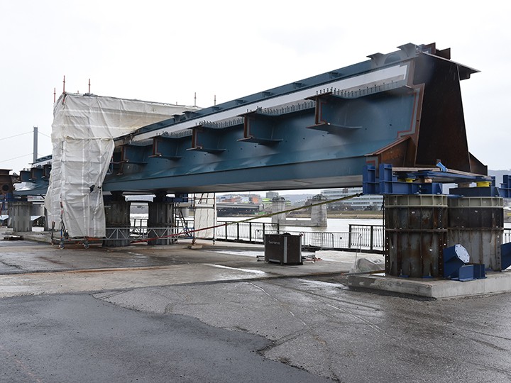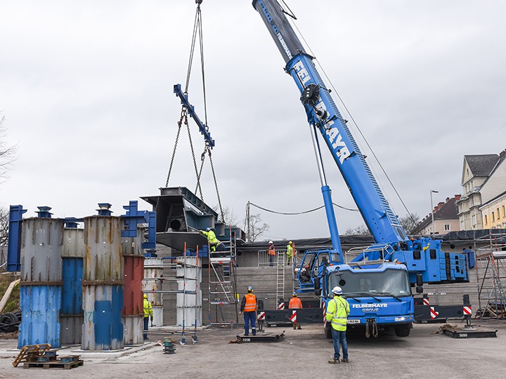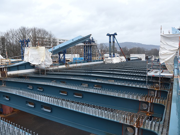 Die beiden letzten Hauptträgerelemente mit einem Gewicht von je circa 45 Tonnen wurden eingehoben. Dafür war ein 500-Tonnen–Kran vonnöten.
