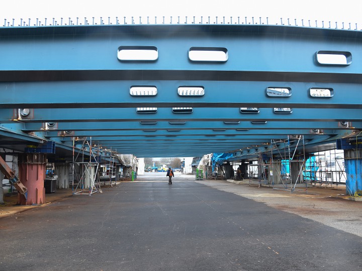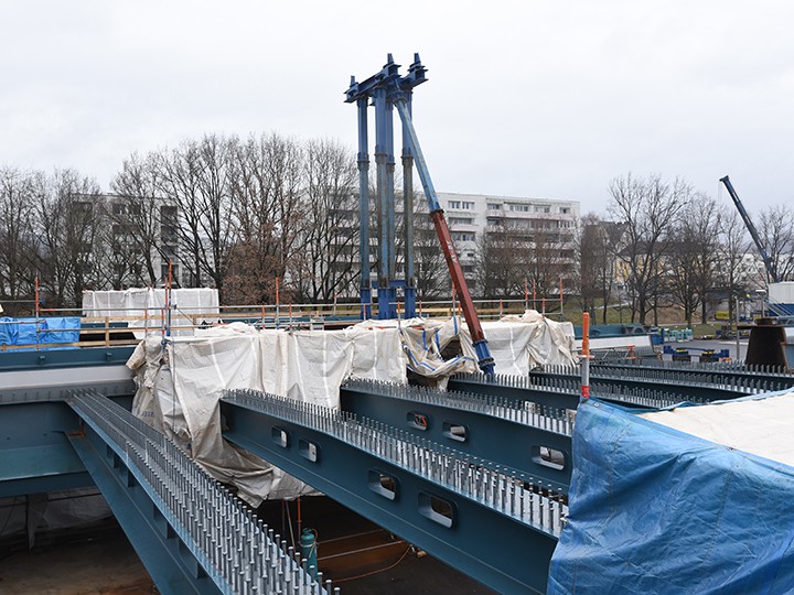 Bis Mitte April werden die Schweißarbeiten an den Tragwerkstößen fertiggestellt und der Korrosionsschutz aufgetragen. Anschließend steht die Herstellung der Fahrbahnplatte aus Stahlbeton im Zweischichtbetrieb auf dem Programm. Dann folgt die Herstellung und Anbringung der Randbalken, ebenso wie die Fahrbahnaufbauten aus Asphalt und der Brückenausrüstung. Diese besteht aus rund 800 Meter Geländer mit Handlaufbeleuchtungen für die Beleuchtung der Geh- und Radwege. Bis Juni sind auch die Straßenbauarbeiten und Leitungsverlegungen in der Linken Brückenstraße geplant.