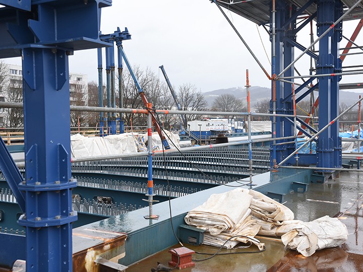 In den Sommermonaten werden weitere Stahlteile für die Über-Wasser-Tragwerke und das Landtagewerk angeliefert. Parallel werden bis zum Winter die Korrosionsschutzarbeiten durchgeführt. Beim Brückenbau finden bis zu 70 Mann Beschäftigung.