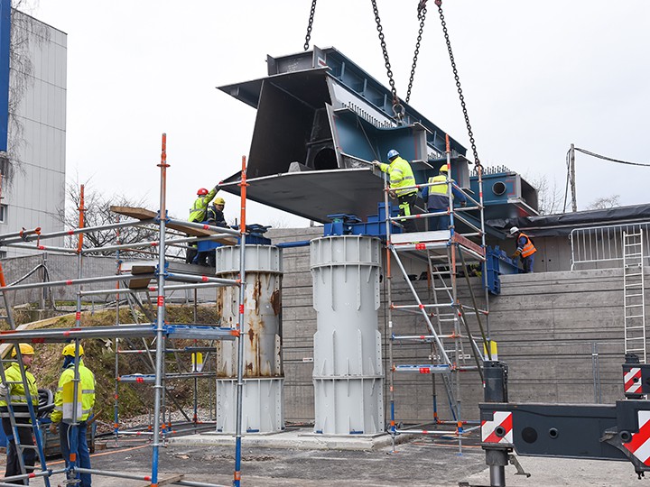 Mittels Kran werden die einzelnen Stahlteile in Position gebracht.