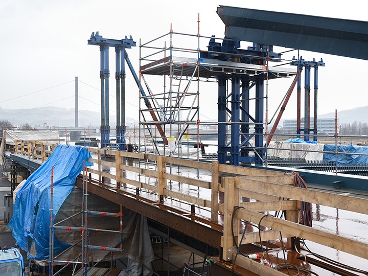 Der mittlere Brückenbogen hat seinen Platz bereits eingenommen.