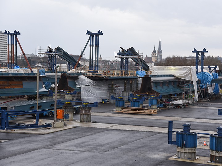 Die Stahlbauarbeiten im Werk gehen voran. Es erfolgt die schrittweise Anlieferung der Großbauteile, hauptsächlich aus dem MCE Werk Slaný. Weiters wird der Aufbau der Montagehilfskonstruktionen für den ersten Brückenbogen durchgeführt.