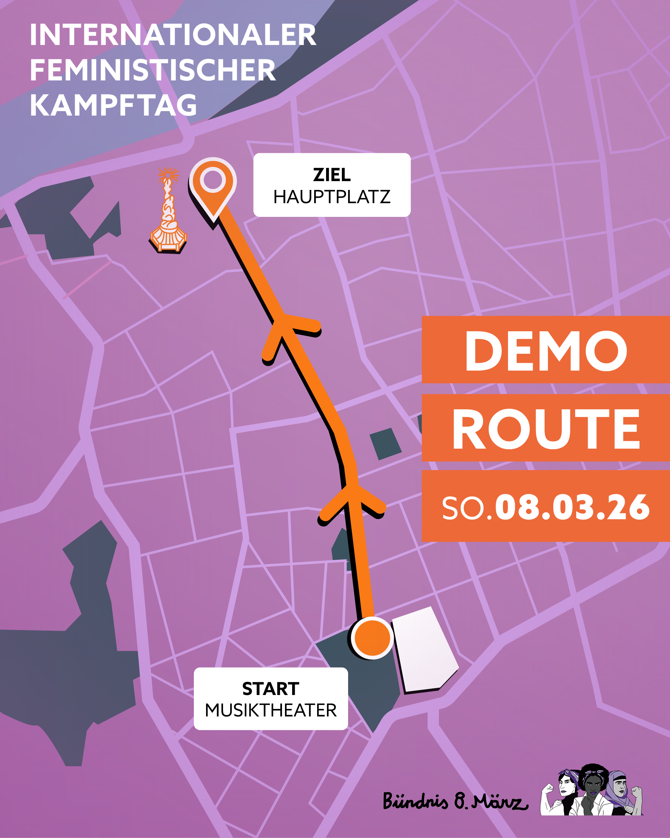 Der Internationale feministische Kampftag findet heuer am Sonntag, dem 08. März 2026 statt. Treffpunkt ist um 14:00 Uhr beim Linzer Musiktheater, von wo aus die Demo über die Landstraße bis zum Hauptplatz verlaufen wird.