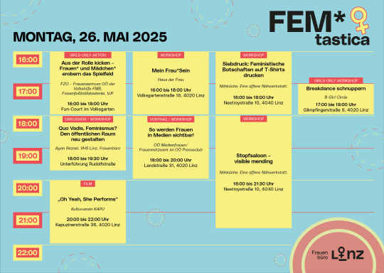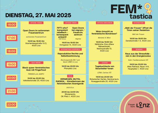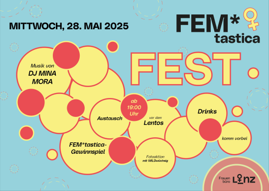 Bei FEM*tastica, den langen Nächten des Feminismus kannst du die „fem*tastische“ Seite von Linz kennenlernen: Es gibt Vorträge, künstlerische Workshops, Aktionen, Filmvorführungen, Open Doors, Gespräche, Lesungen, Performances und vieles mehr – direkt von und mit Organisationen, die tagtäglich Feminismus in ihrer Arbeit leben.