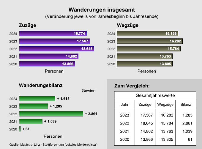 „Linz ist und bleibt ein attraktiver Wohnort. Dies zeigt die jährlich ansteigende Bevölkerungsentwicklung. Das ist erfreulich. Es zeigt, dass Linz Vieles zu bieten hat – vom Arbeitsplatz bis hin zum leistbaren Wohnen“, ist der Geschäftsführende Vizebürgermeister Dietmar Prammer überzeugt. Das Bevölkerungswachstum des Jahres 2024 ist ausschließlich auf die Wanderungsbilanz zurückzuführen. „Sowohl die Zuzüge als auch die Wegzüge haben sich gegenüber dem Vorjahr etwas verringert. Exakt 16.774 Zuzüge stehen 15.159 Wegzügen gegenüber, was zu einer positiven Wanderungsbilanz führt“, erklärt Prammer.