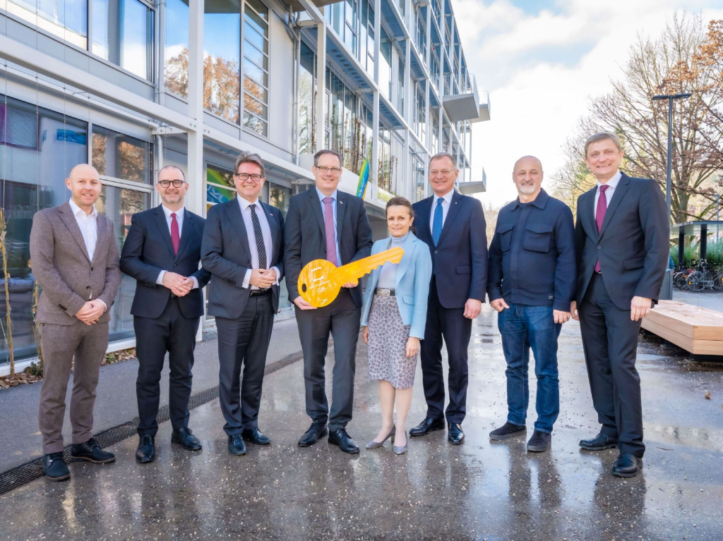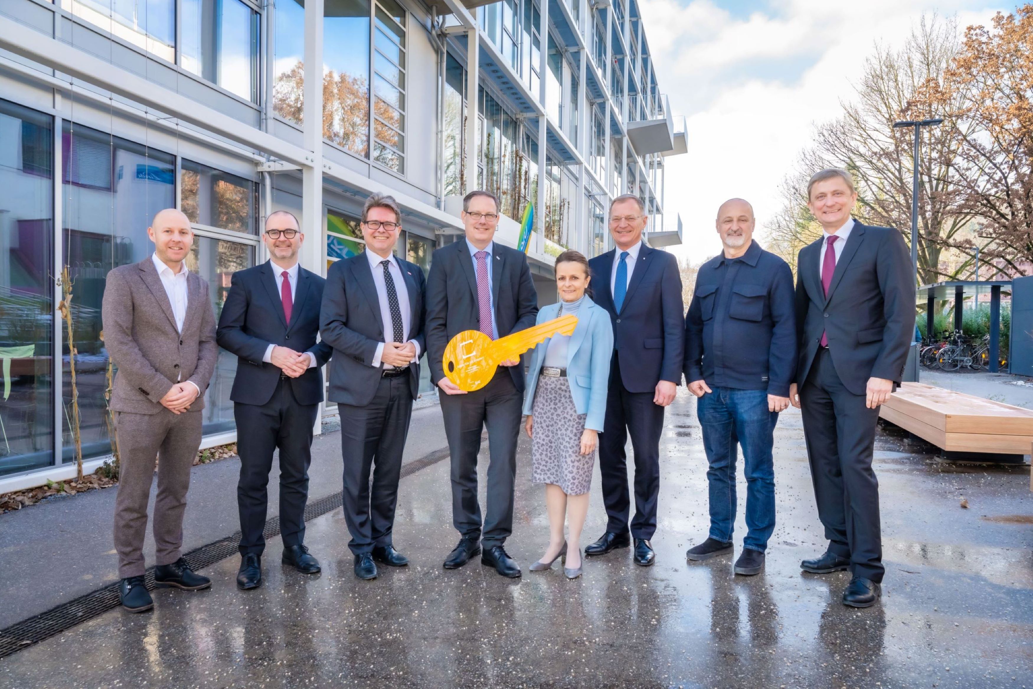Schlüsselübergabe: v.li.: JKU Vizerektor Alexander Freischlager, Dietmar Prammer, geschäftsführender Vizebürgermeister der Stadt Linz, Bundesminister Martin Polaschek, JKU Rektor Stefan Koch, Christine Dornaus, Geschäftsführerin der Bundesimmobiliengesellschaft, Landeshauptmann Thomas Stelzer, Architekt Peter Sapp (querkraft) und Michael Tumpel, Dean der JKU Business School.
