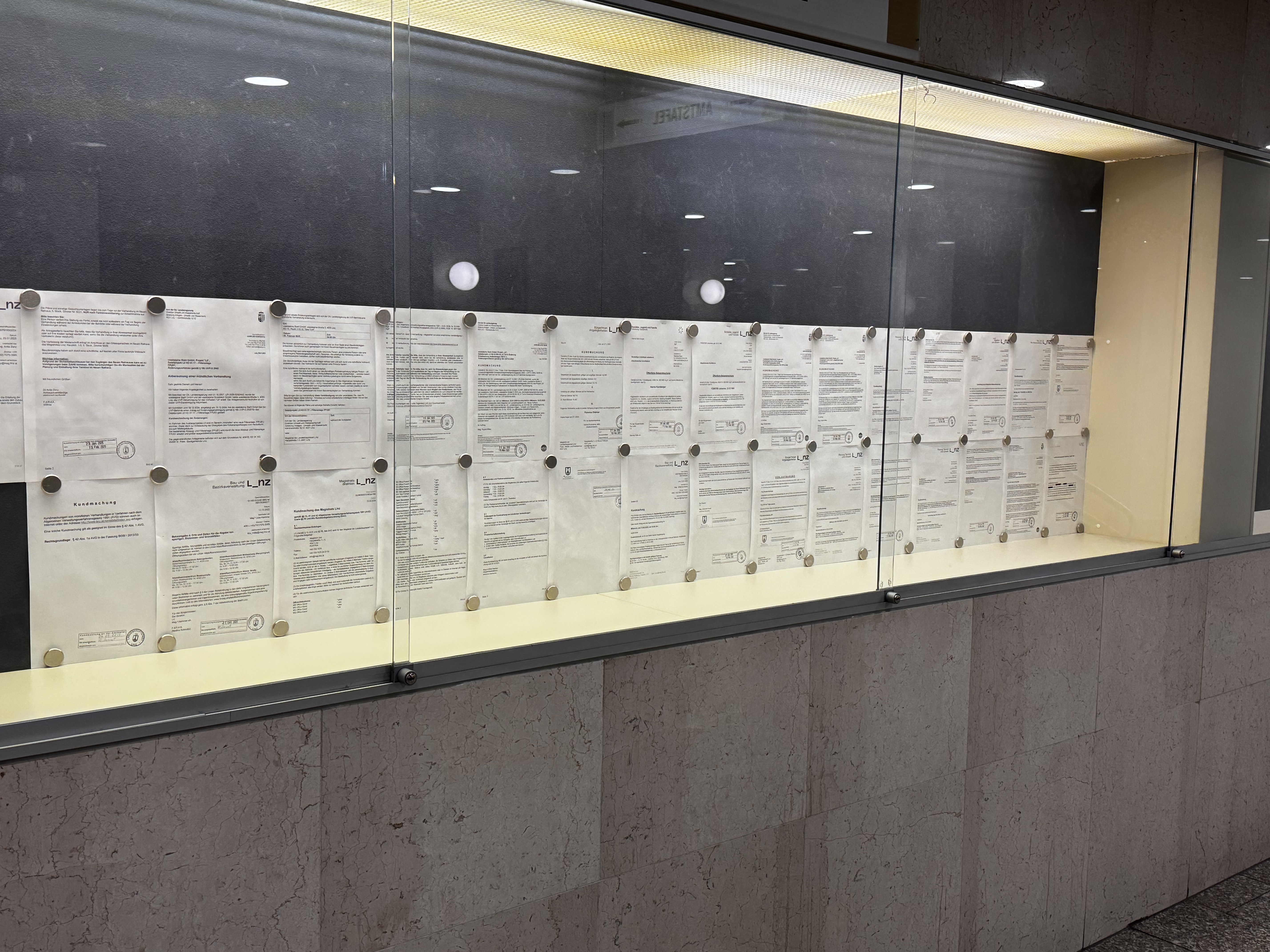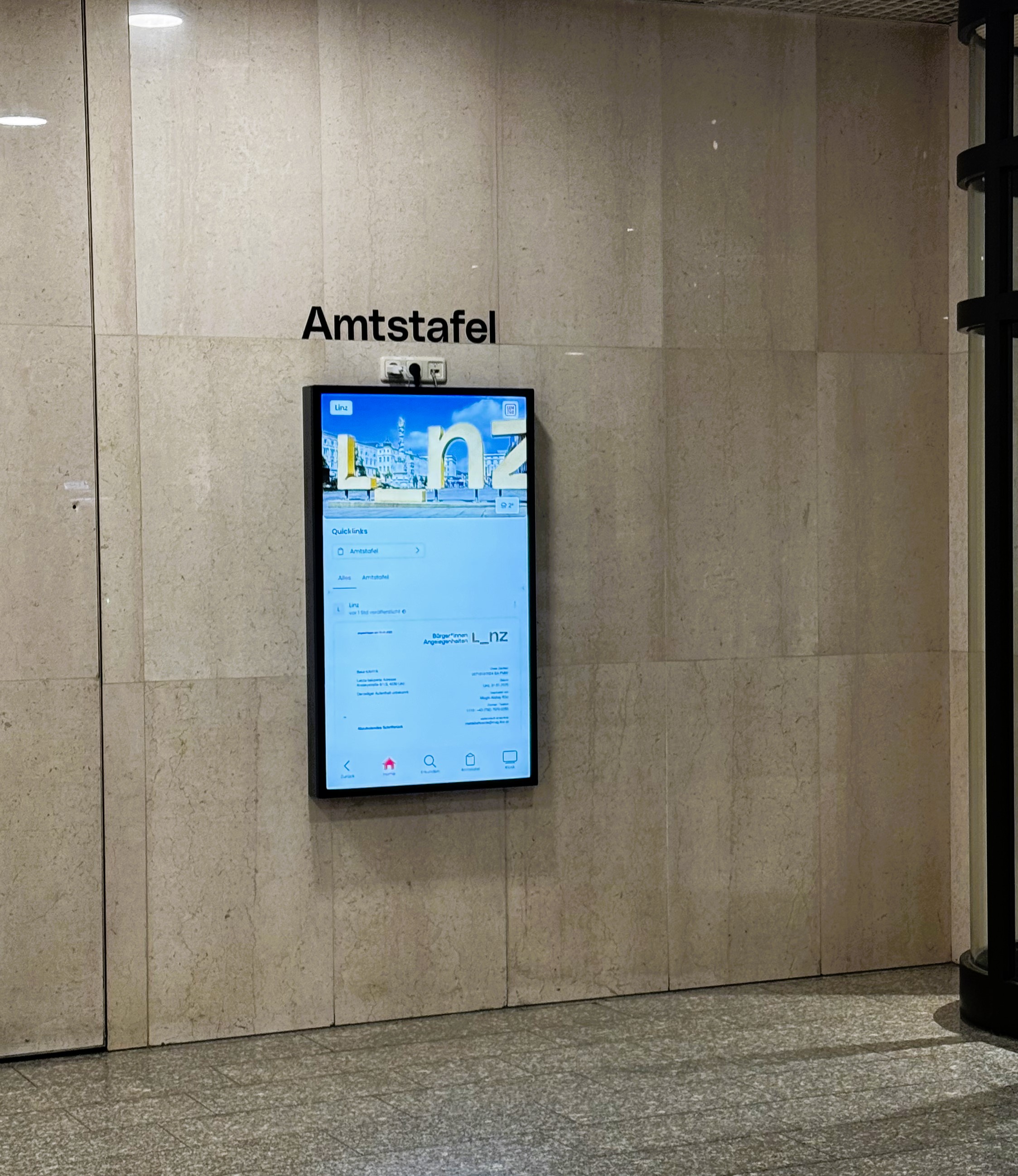 Die Inhalte der Digitalen Amtstafel können auch im Wege der „Online Amtstafel“ eingesehen werden. Rechtsverbindlicher Charakter kommt jedoch ausschließlich den Inhalten der digitalen Amtstafel im Foyer des Neuen Rathaus der Landeshauptstadt Linz (Hauptstraße 1 – 5, 4041 Linz) zu.