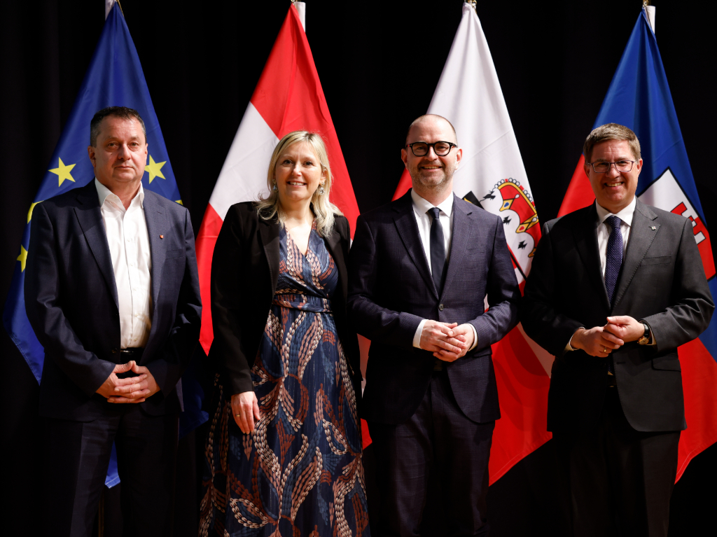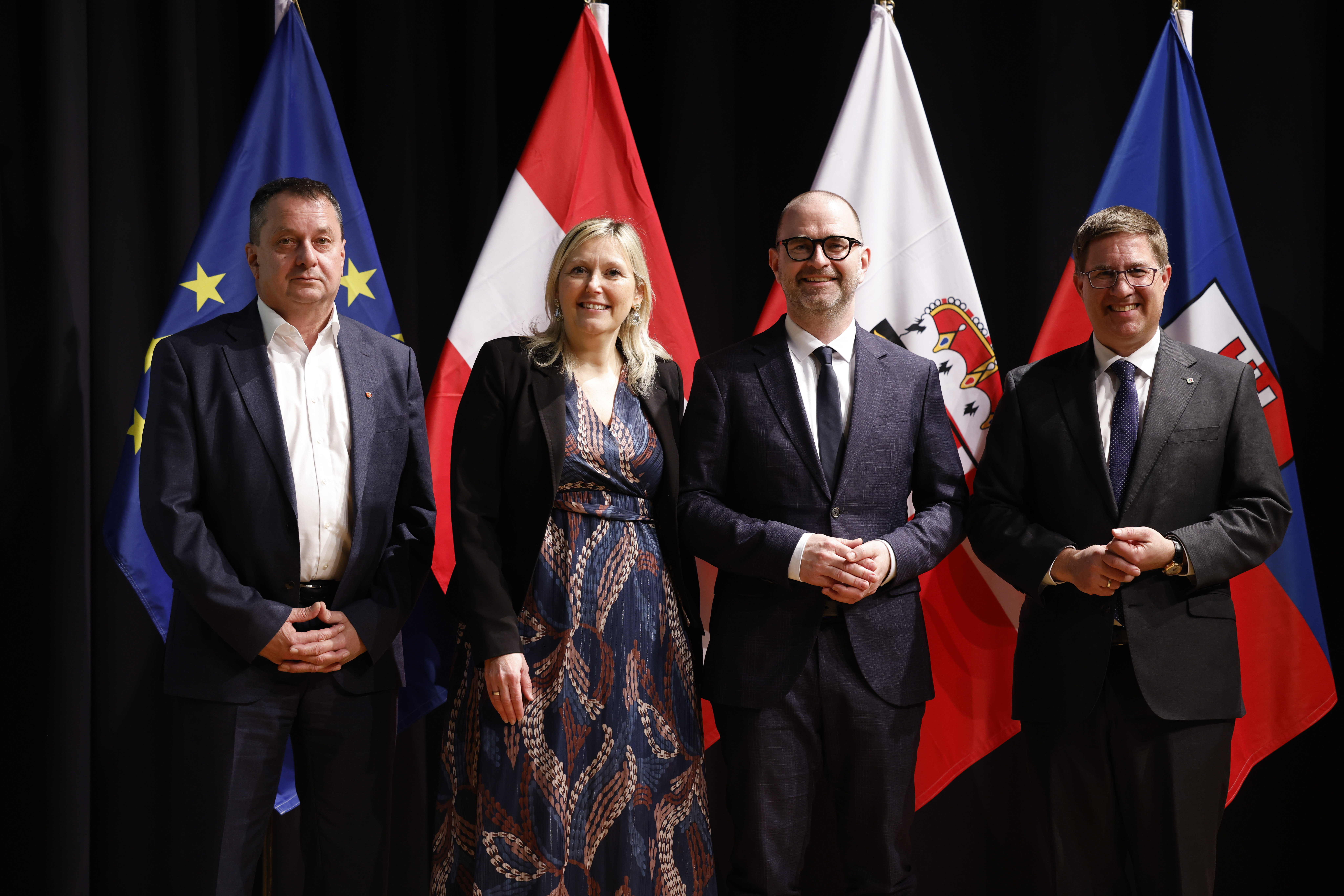 Der neu gewählte Vorsitzende des oberösterreichischen Städtebundes, Dietmar Prammer (3.v.l), mit den stellvertretenden Vorsitzenden Landtagsabgeordneter Bürgermeister Anton Froschauer (Perg), Bürgermeisterin Dr.in Sabine Naderer-Jelinek (Leonding) und Bürgermeister Mag. Dr. Andreas Rabl (Wels); v. links nach rechts.