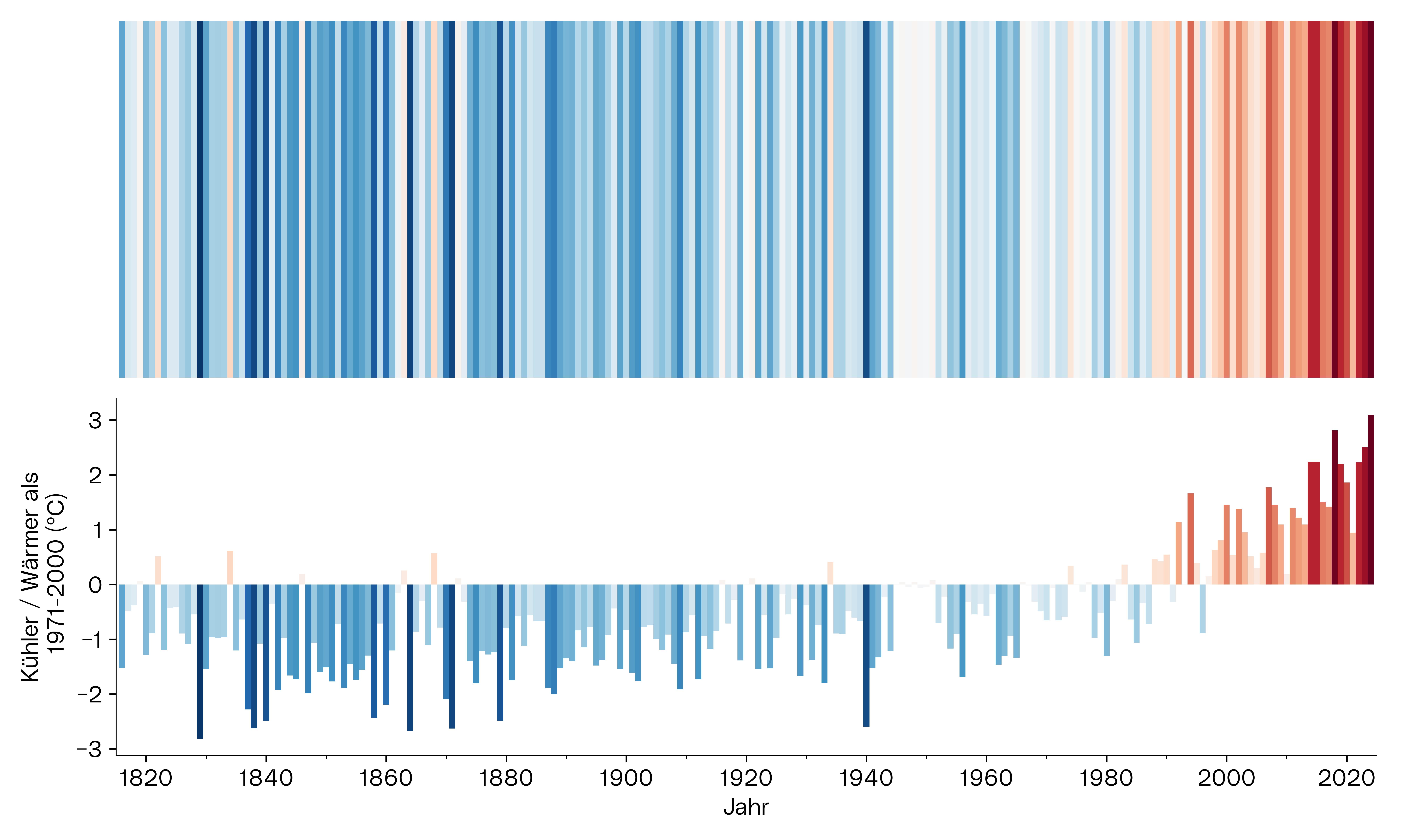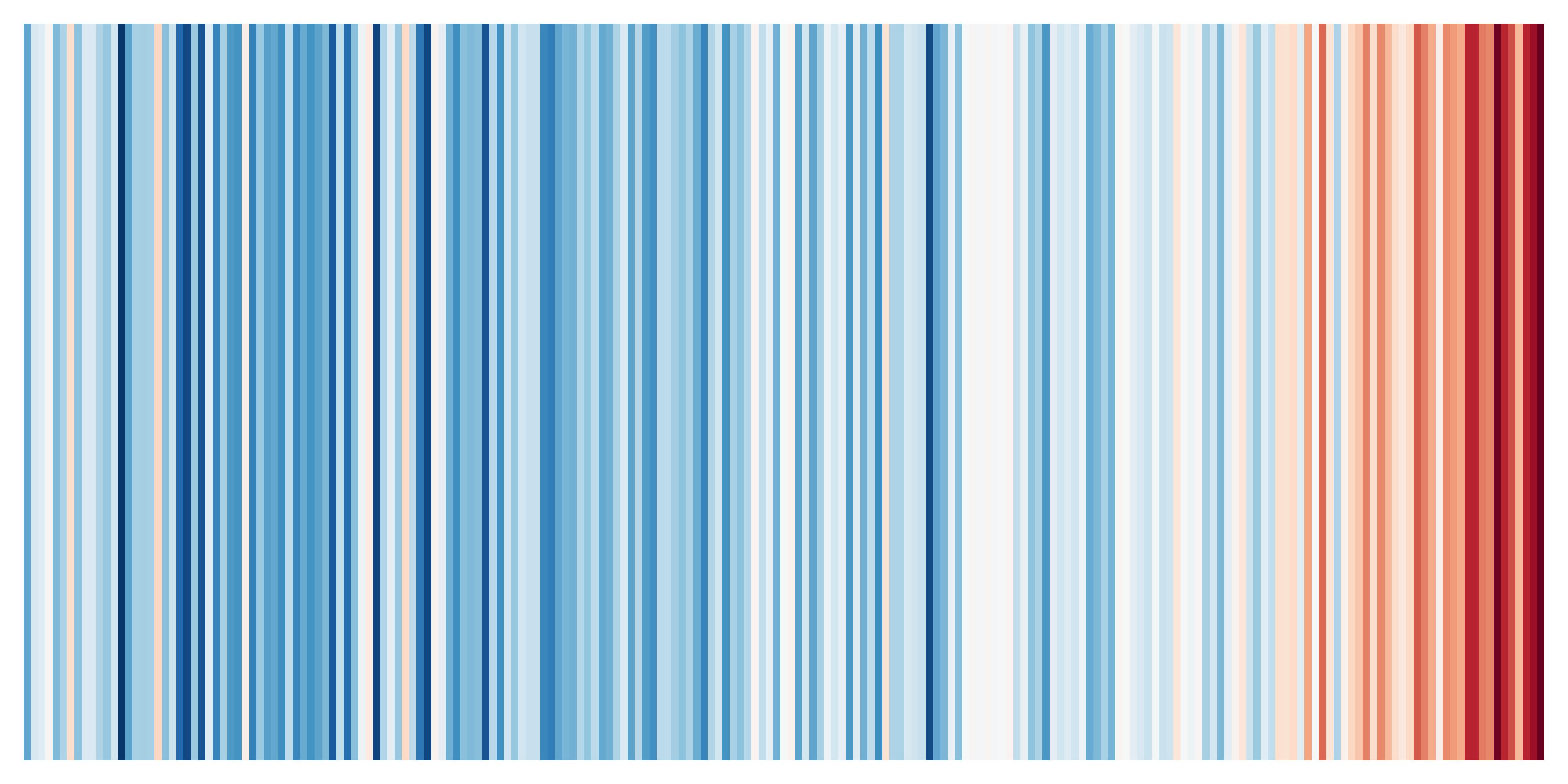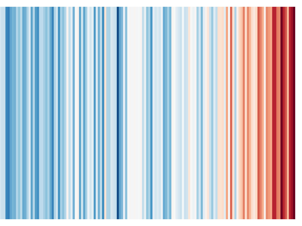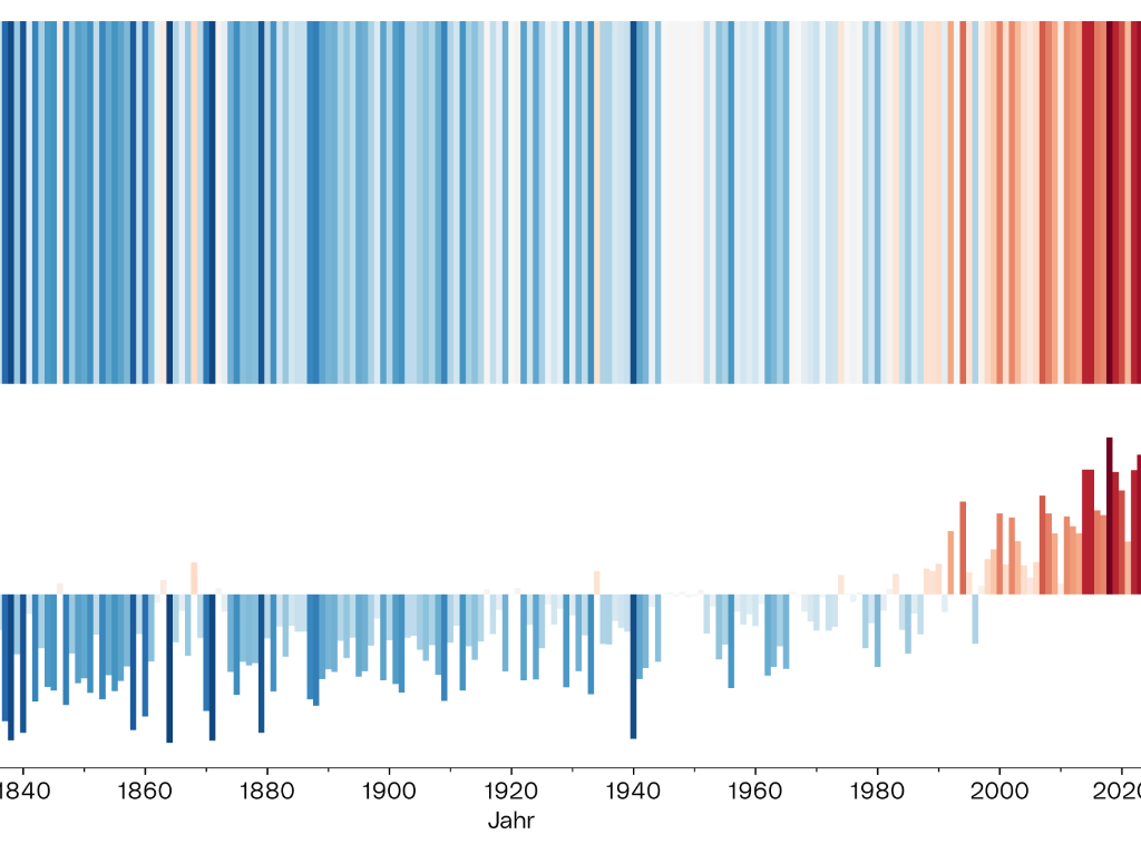 Die Klimastreifen zeigen farblich kodiert, wie sich die jährliche Durchschnittstemperatur zum langjährigen Mittel von 1971 bis 2000 verhält.
