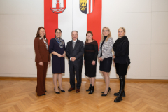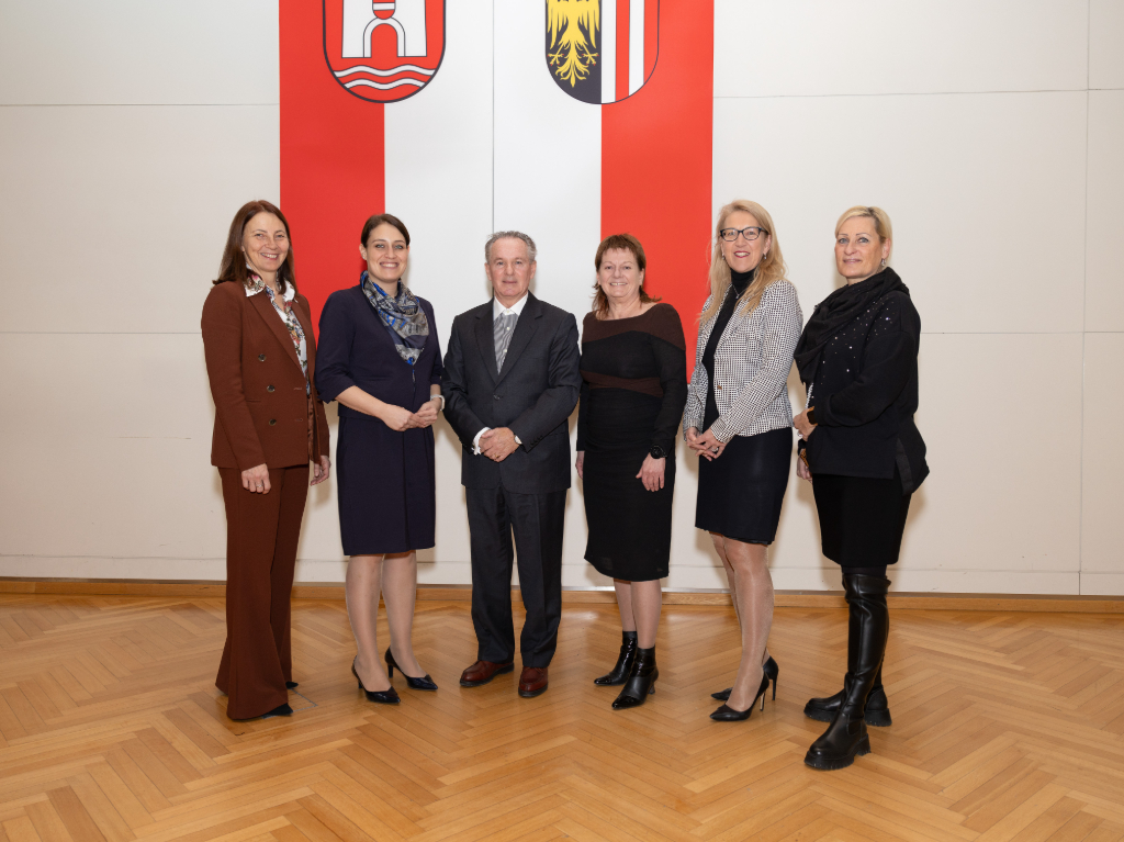 Im Bild von links: Personaldirektorin Mag.a Brigitta Schmidsberger, Personalreferentin Vizebürgermeisterin Tina Blöchl, der pensionierte Mitarbeiter des Geschäftsbereichs Gebäudemanagement und Tiefbau Robert Schilcher, Vizebürgermeisterin Karin Hörzing in Vertretung des Linzer Bürgermeisters Dietmar Prammer, Magistratsdirektorin Ulrike Huemer und Karin Decker, Vorsitzende der Personalvertretung des Magistrat Linz.
