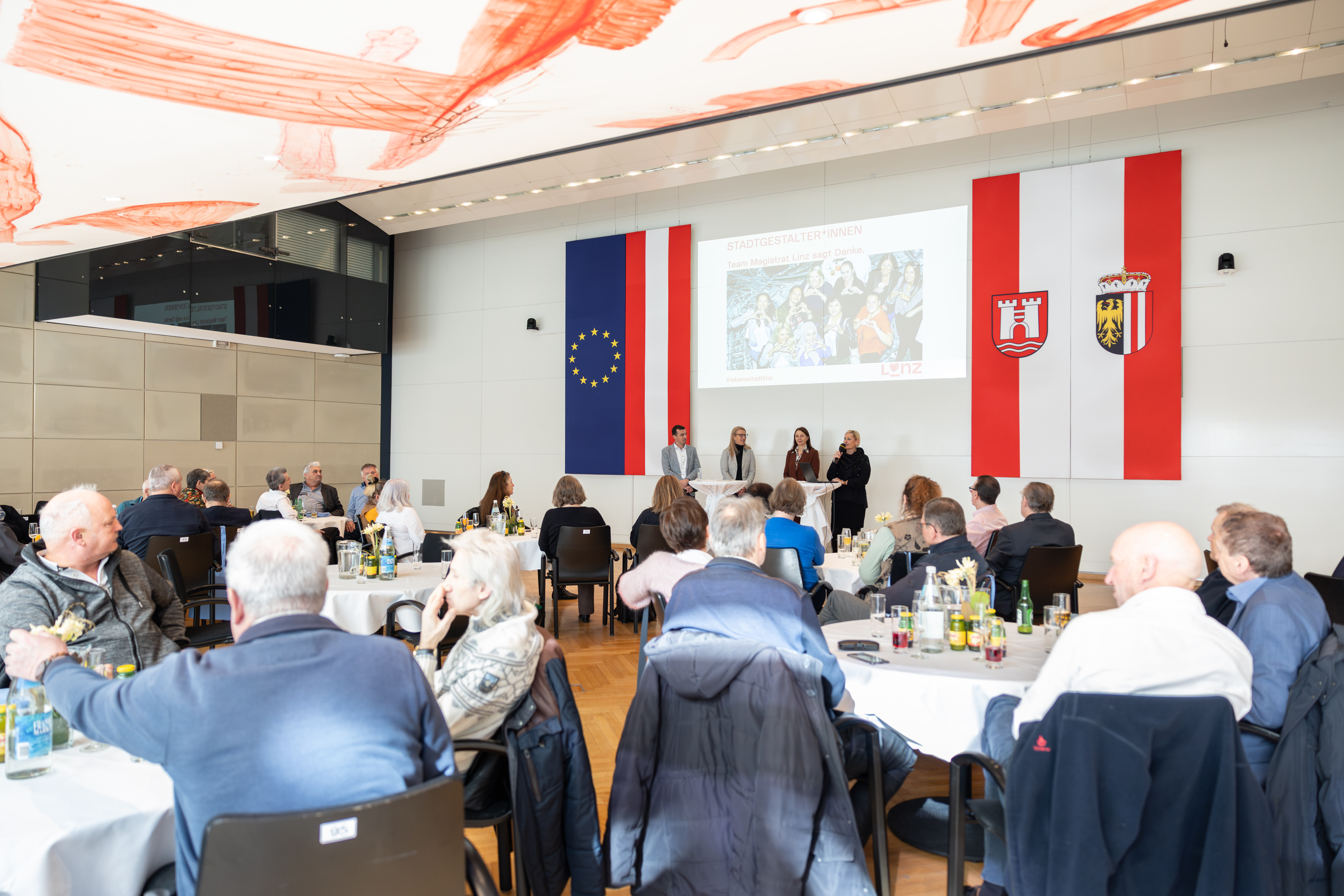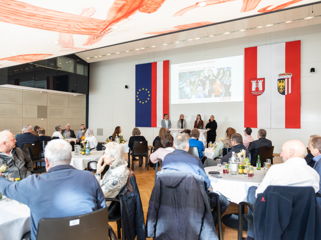 „Mit dieser Feier wollen wir uns nicht nur für die jahrzehntelange Arbeit bedanken, sondern auch die Verdienste unserer ehemaligen Mitarbeiter*innen sichtbar machen. Denn jede und jeder Einzelne von ihnen hat Linz mitgestaltet und einen wertvollen Beitrag zur Entwicklung unserer Stadt geleistet“, betonen Vizebürgermeisterin Karin Hörzing, stellvertretend für Bürgermeister Prammer, und Vizebürgermeisterin Personalreferentin Tina Blöchl. „Ihre Arbeit bleibt nicht nur in Erinnerung – sie hinterlässt Spuren und wirkt in der Weiterentwicklung unserer Stadt nach. Mit dieser Feier würdigen wir diesen Übergang und sprechen unseren langjährigen Mitarbeiter*innen unsere Wertschätzung und unseren Dank aus.“