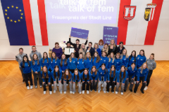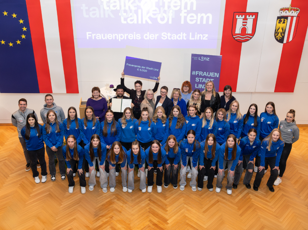 Daniela Huber und Dominik Thaller wurden im Rahmen der festlichen Veranstaltung „talk of fem“ für ihren Dokumentarfilm über den Frauenfußballverein Union Kleinmünchen ausgezeichnet. Im Bild Sportreferentin Vizebürgermeisterin Karin Hörzing (li. hinten) und Frauenstadträtin Mag.a Eva Schobesberger (Mitte) sowie die Jury- und Vereinsmitglieder mit ihren Trainer*innen.