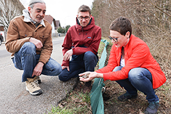 Stadträtin Mag.a Eva Schobesberger, Thomas Schiefecker und Michael Lederer (links) beim Krötenzaun in Kleinmünchen am Rand des Wasserwaldes.