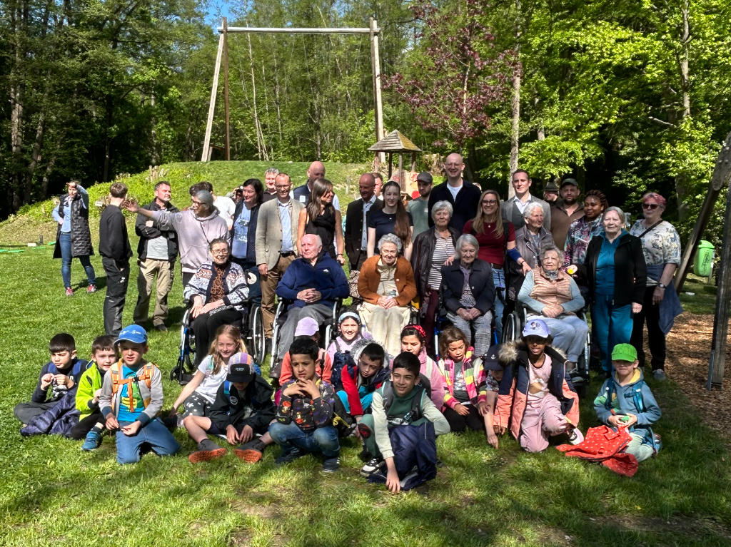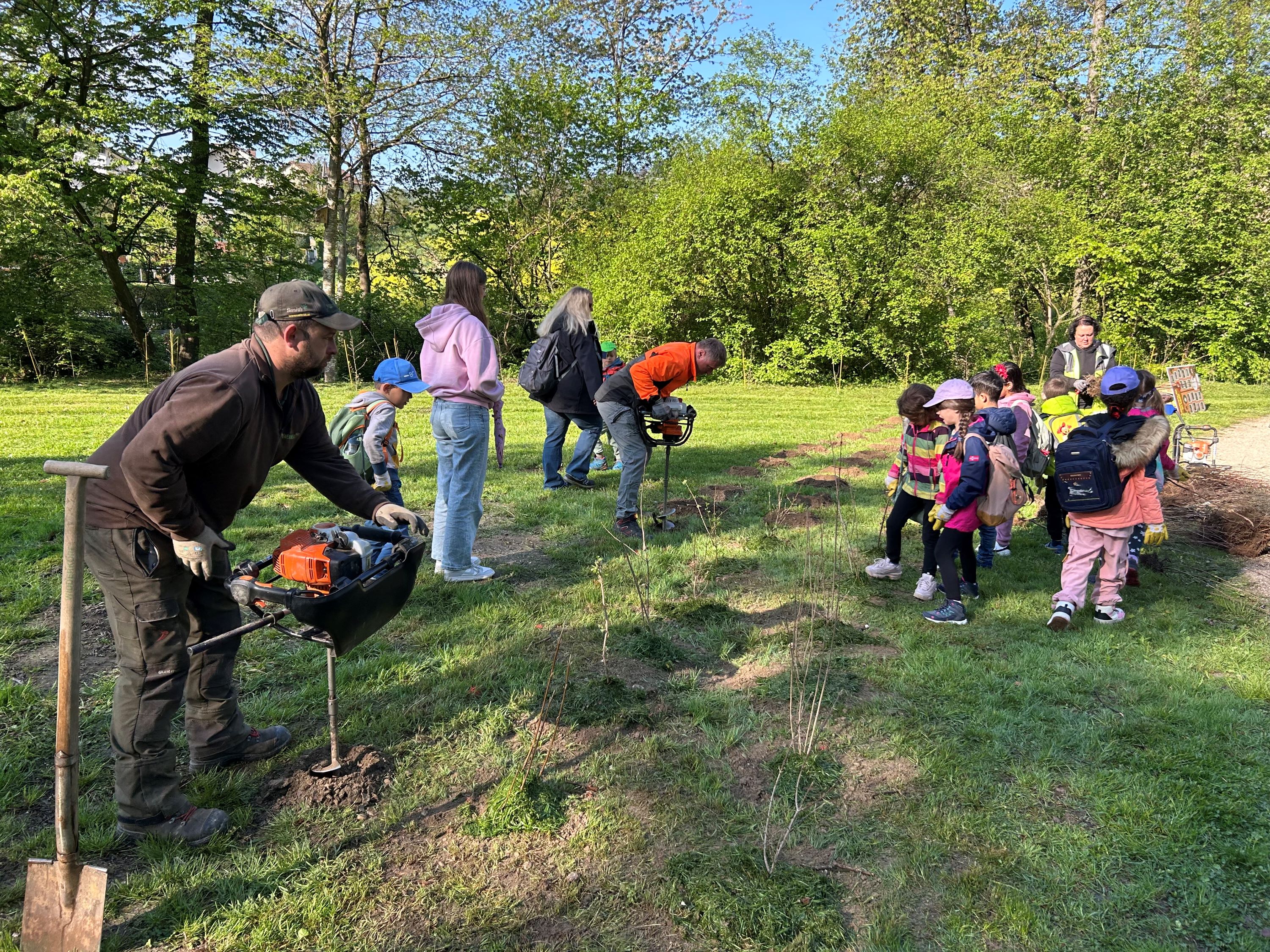 Stadtrat Thomas Gegenhuber freut sich mit den Kindern und den Senior*innen über die zahlreichen Baumpflanzungen