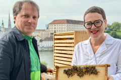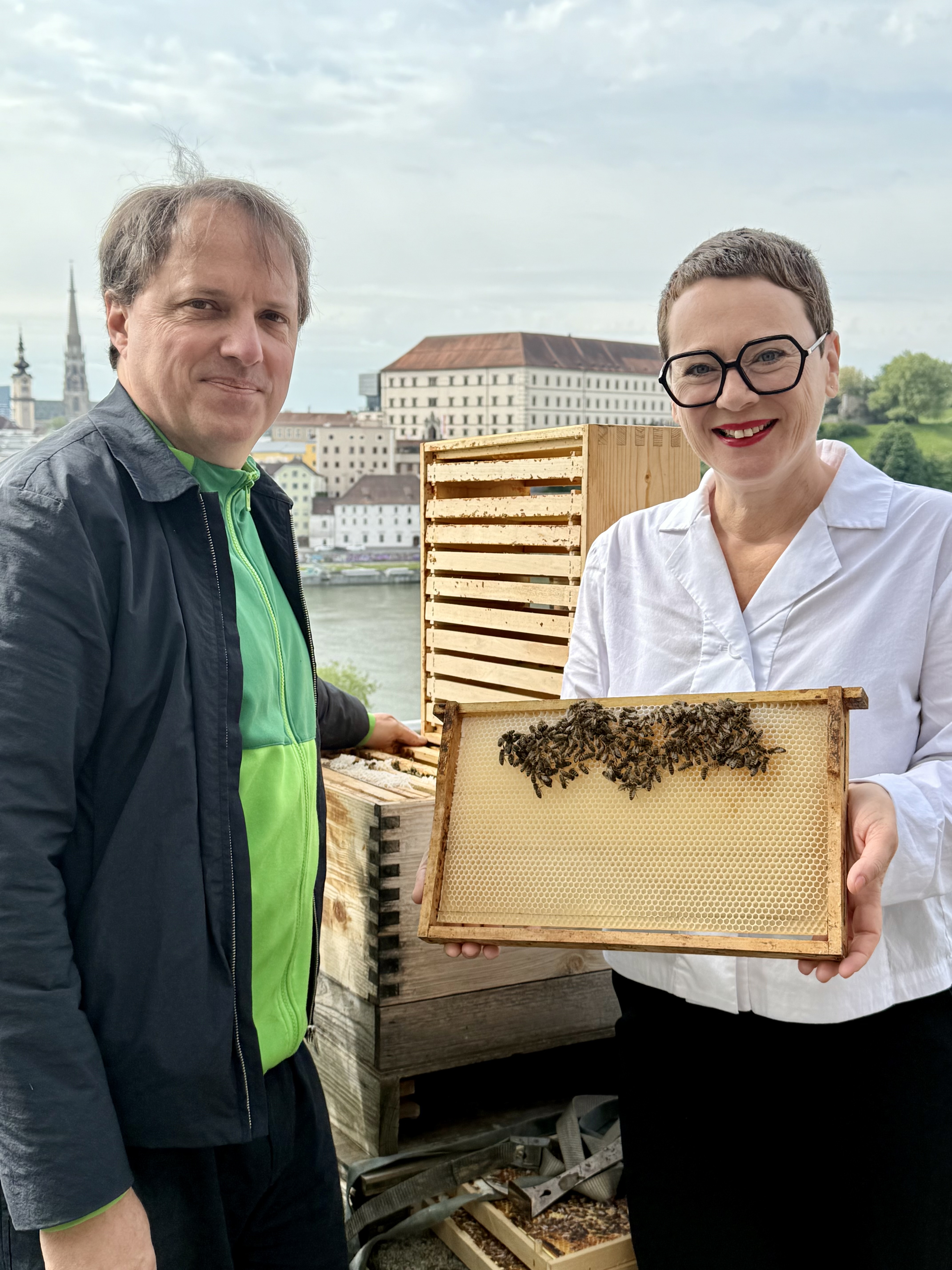 Klimastadträtin Mag.a Eva Schobesberger und Imker Bernhard Rihl bei den Bienen auf den Terrassen des Neuen Rathauses