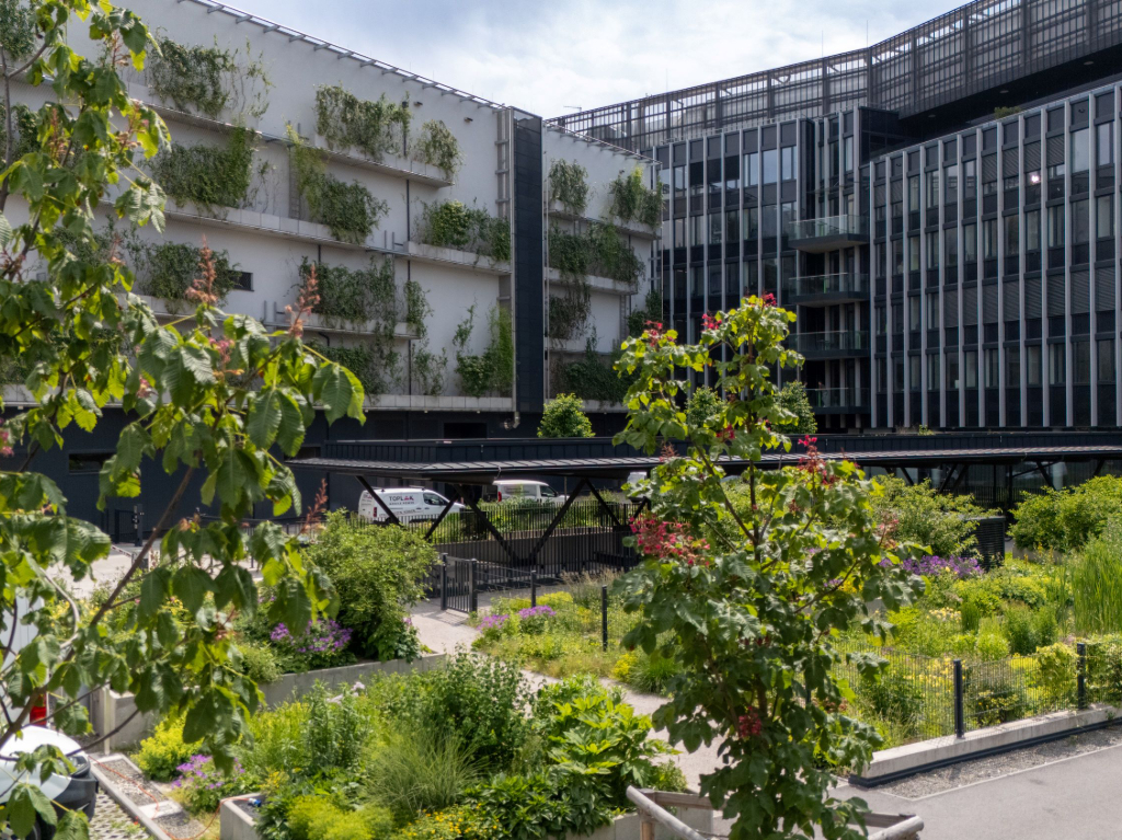 Neues Netzgebäude – Innenhof, Oberfeldstraße 4, Linz. Im begrünten Teil links befindet sich das neue IT- und Data Center.