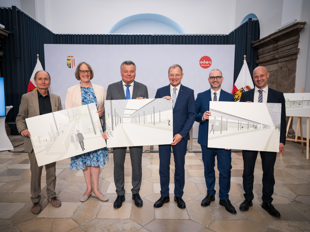 Präsentation Architekturwettbewerb: v.l.: Dipl.-Ing. Andreas Dworschak, GF Archinauten ZT GmbH, Dipl.-Ing.in Sonja Wiesholzer, GF Schiene OÖ, LR Mag. Günther Steinkellner, Infrastruktur-Landesrat, LH Mag. Thomas Stelzer, Landeshauptmann, Mag. Dietmar Prammer, Bgm. Linz und Mag. Martin Hajart, Vzbgm. Linz.