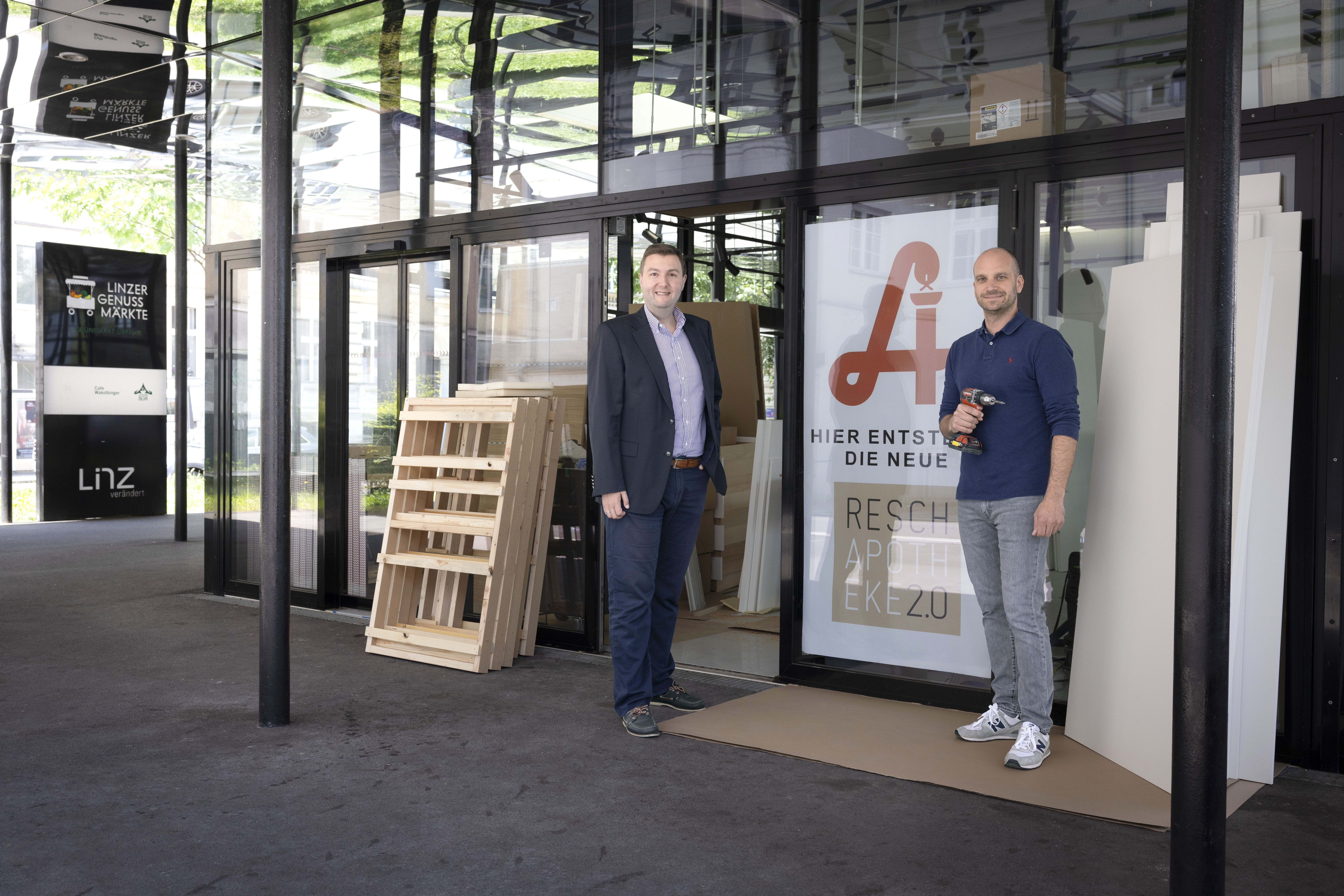 Gesundheitsstadtrat Dr. Michael Raml beim Lokalaugenschein am neuen Standort mit Apotheker Michael Pröll, Eigentümer der Resch Apotheke.
