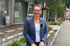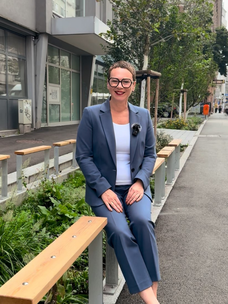 Stadträtin Mag.a Eva Schobesberger freut sich über die 14 neuen gepflanzten Bäume entlang der Bürgerstraße.