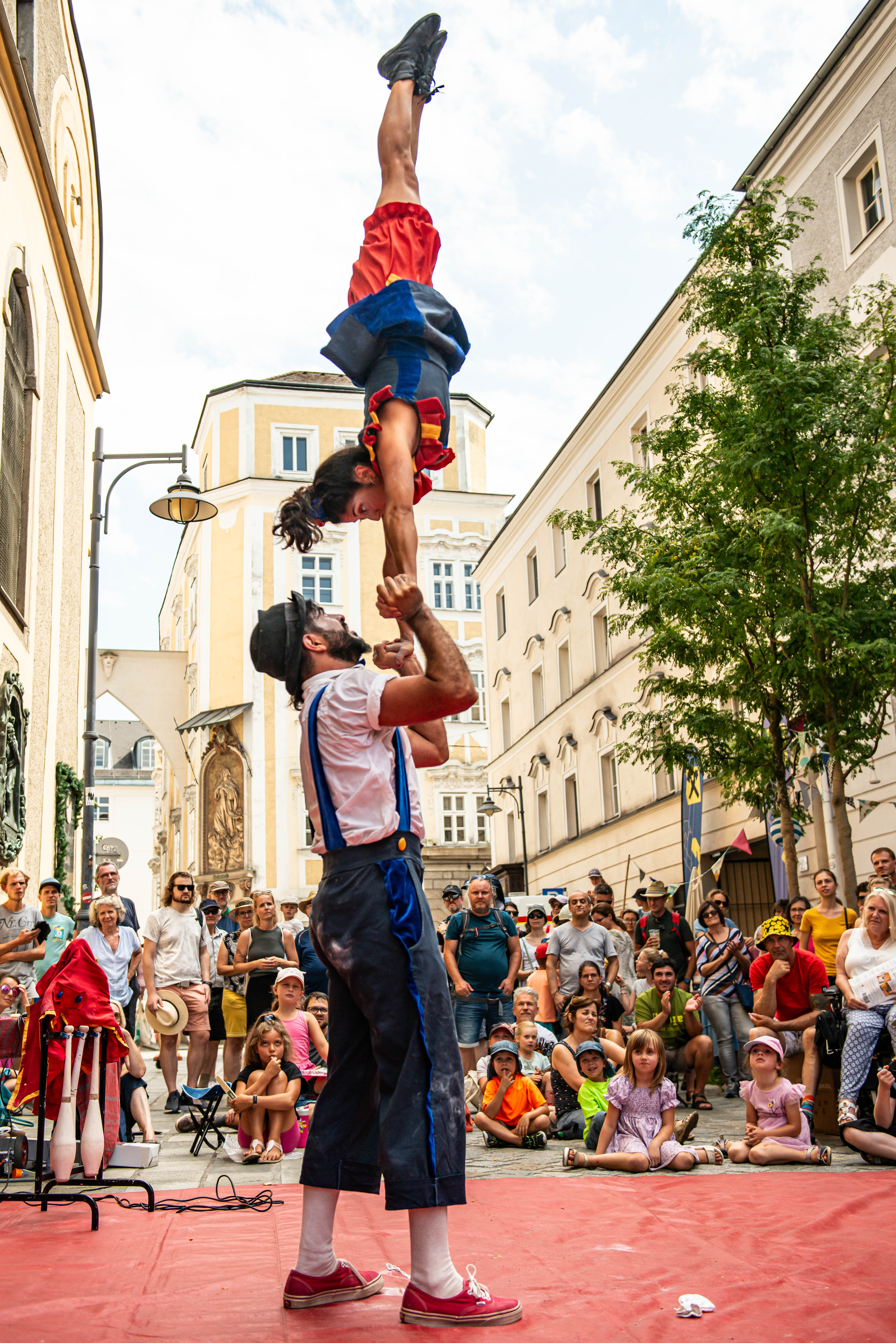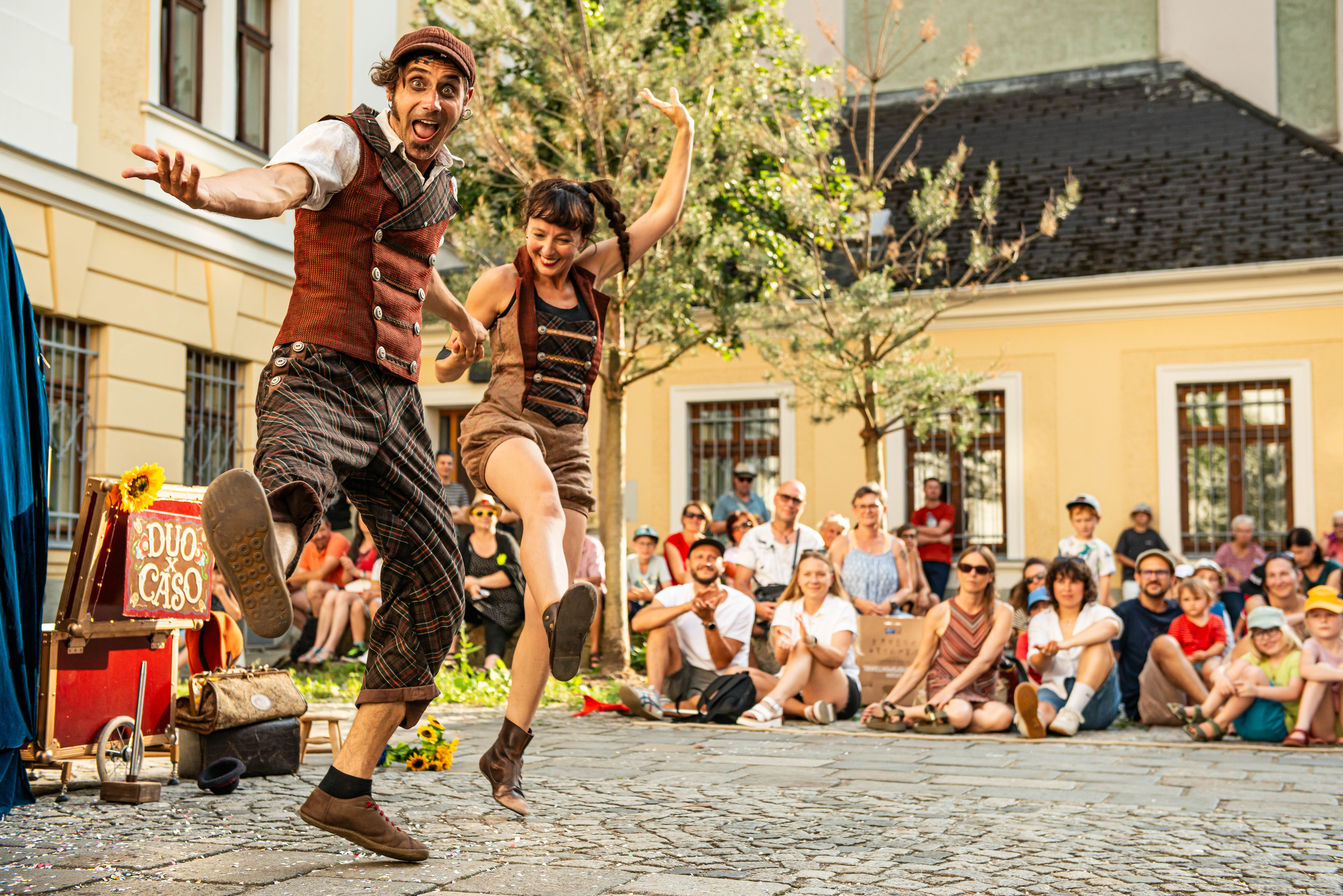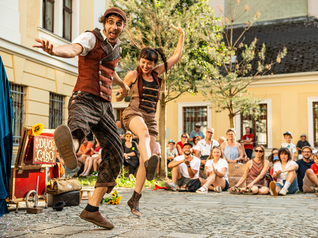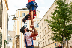 Wie international die Straßenkunst sein kann, zeigen auch Elisabetta und Thomas von „DuoxCaso“. Die beiden Künstler*innen, die auch privat ein Paar sind, leben gemeinsam in Spanien, obwohl Thomas aus Österreich und Elisabetta aus Italien kommt. Die beiden begeisterten schon im letzten Jahr nicht nur das Publikum mit ihrer akrobatischen Clown-Show. Auch das Veranstaltungsteam war von den beiden angetan und bat sie kurzerhand, für das Motiv des diesjährigen Plakates Model zu stehen.