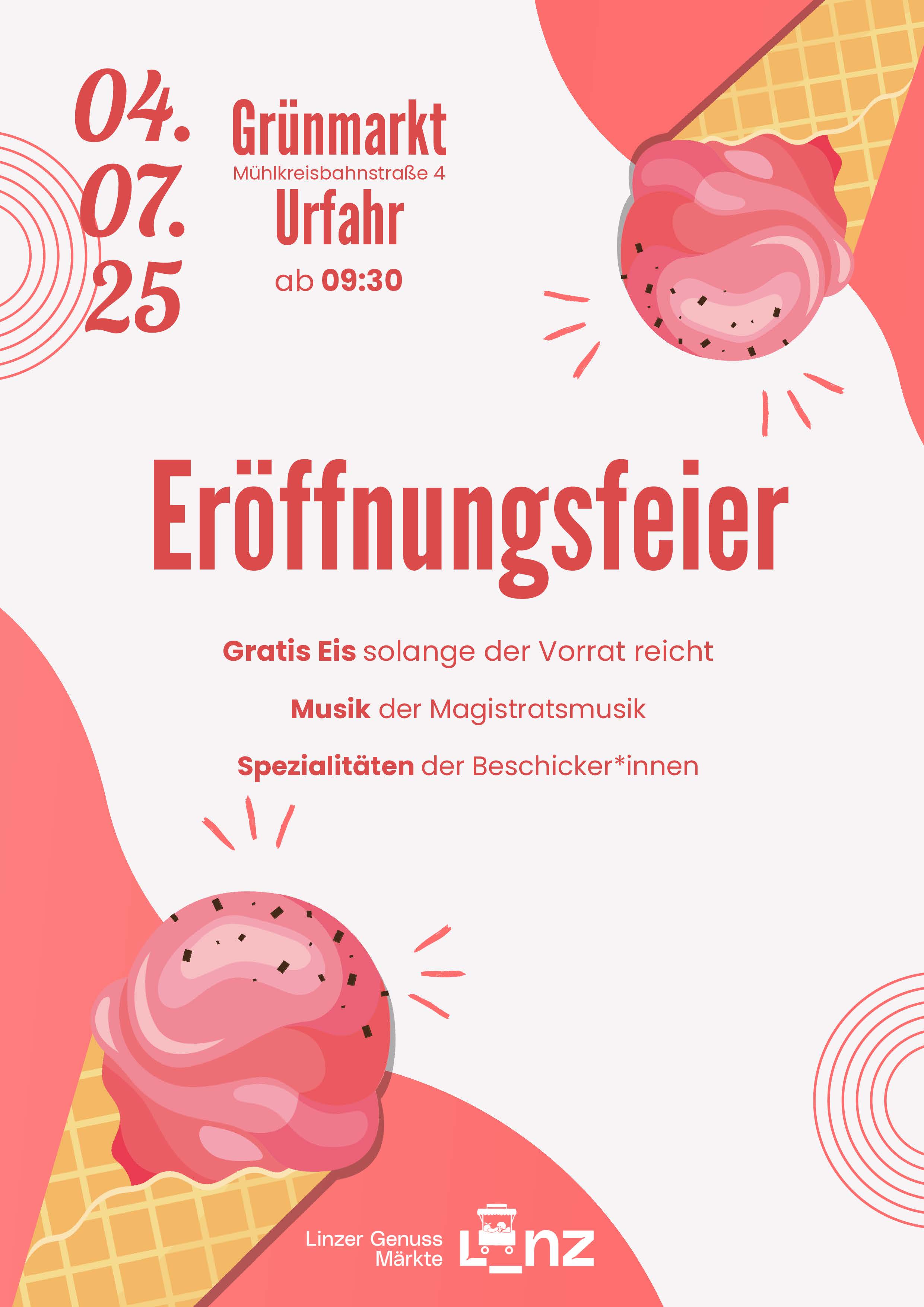 Feierliche Eröffnung des Freitagsmarktes am Grünmarkt Urfahr Marktreferent Mag. Martin Hajart lädt alle zum Hinkommen und Mitfeiern ein. Es gibt Gratis-Eis, Musik und kulinarische Spezialitäten
