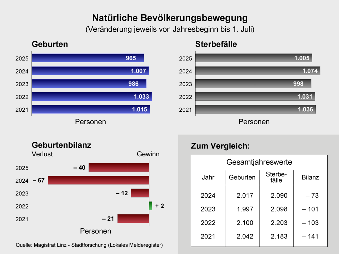 965 Geburten in der ersten Hälfte 2025 stehen 1.005 Sterbefälle gegenüber.