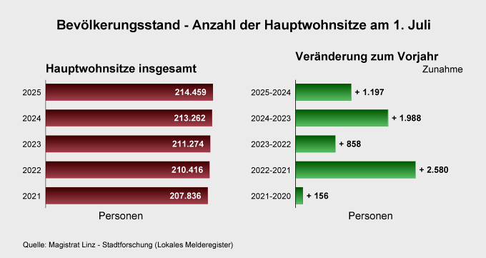 Das Bevölkerungswachstum in der Landeshauptstadt Linz weist ungebrochen positive Tendenzen auf. Mit 1. Juli 2025 ist die Zahl der Hauptwohnsitze von 213.262 im Vergleichszeitraum des Vorjahres auf nunmehr 214.459 angewachsen.
