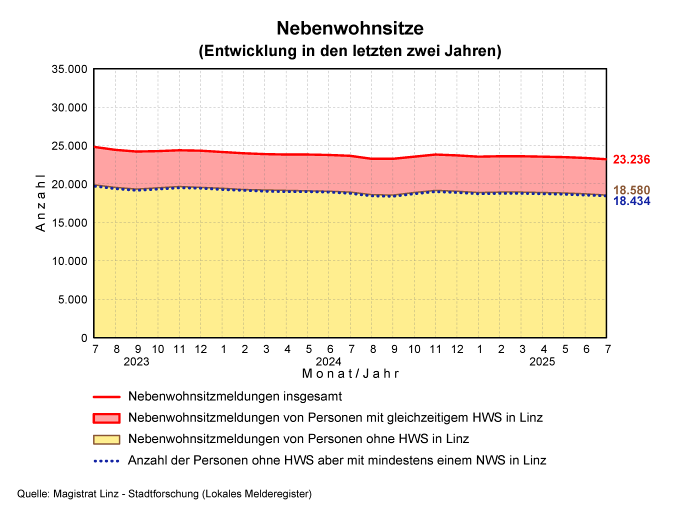 Interessant ist auch der Zweijahresvergleich bei den Nebenwohnsitz-Meldungen von Personen mit gleichzeitigem Hauptwohnsitz in Linz. Dieser zeigt eine Abnahme von 25.000 im Jahr 2023 auf nunmehr 23.200.