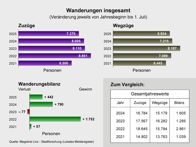 Bei den Wanderungen ist die Bilanz im ersten Halbjahr Jahr 2025 mit einem Plus von 442 jedenfalls positiv: 7.376 Zuzügen stehen 6.934 Wegzüge gegenüber. Enthalten ist in den Statistiken auch der Zuzug von Nicht-Österreicher*innen, der nach einem All-Time-High im Jahr 2022 wieder im Sinken ist. 4.808 Zuzügen von Nicht-Österreicher*innen stehen 4.084 Wegzüge gegenüber.
