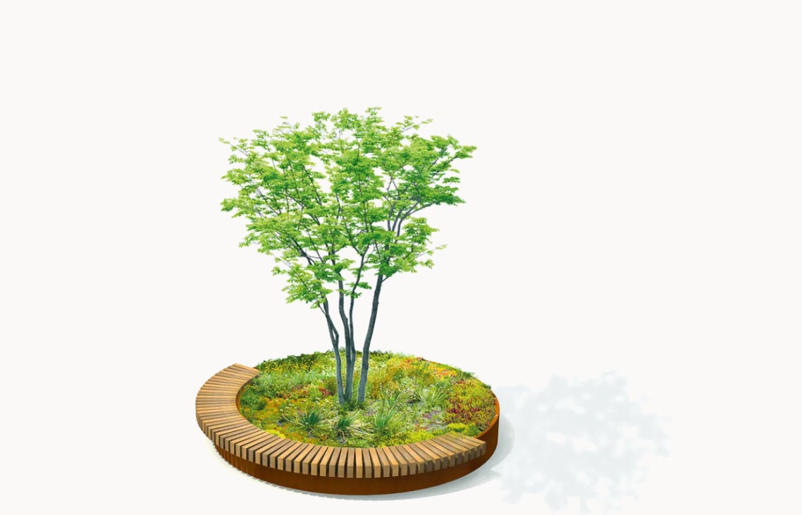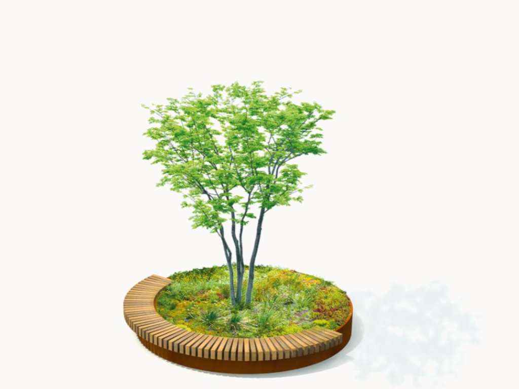 Vorgesehen ist eine begrünte Pflanzinsel mit einem stadtklimafesten Baum, eingefasst von einer Sitzbank in Form eines Dreiviertelkreises. In der offenen Rundung wird zusätzlich ein öffentlicher Trinkbrunnen installiert.