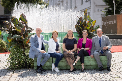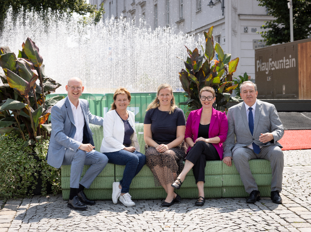 V.l.: Wirtschafts- und Innovationsstadtrat Thomas Gegenhuber, Sozialreferentin Vizebürgermeisterin Karin Hörzing, Marie-Louise Schnurpfeil, Geschäftsführerin des Tourismusverbandes Linz, Klimastadträtin Mag.a Eva Schobesberger und DI Erich Haider, MBA, Linz AG-Generaldirektor eröffnen den Linzer Wasserspielplatz am Pfarrplatz