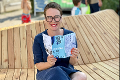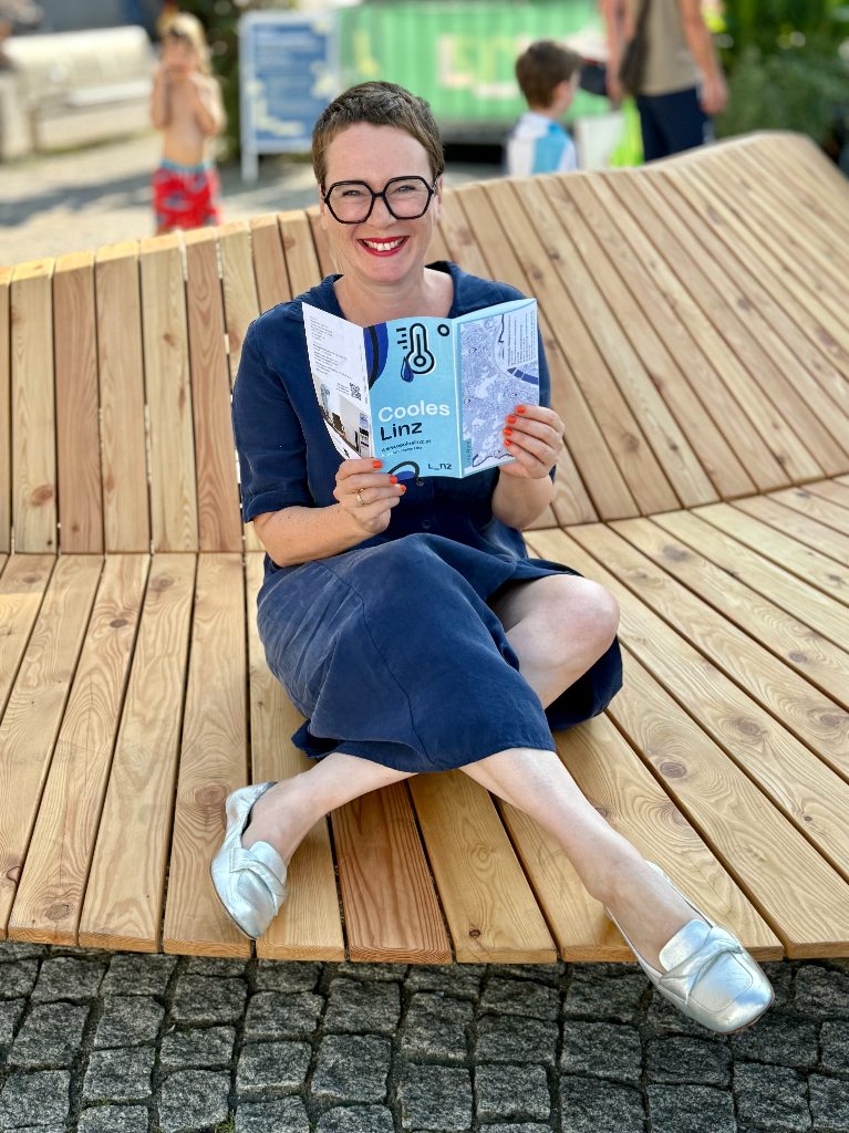 Klimastadträtin Mag.a Eva Schobesberger präsentiert den Faltplan, der alle 27 Orte der Aktion „Cooles Linz“ auf einer Übersichtskarte darstellt.