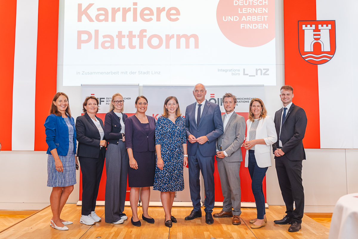 Arbeiten mit noch geringen Deutschkenntnissen – wie dies gelingt, zeigte am Mittwoch, 13. August 2025, die Karriereplattform des Österreichischen Integrationsfonds (ÖIF) in Linz. Im Alten Rathaus stellten fünf Unternehmen – die Österreichische Post AG, die ÖBB, McDonald’s, die ARGE Mobile Betreuung und Pflege sowie AGRU Kunststofftechnik – offene Stellen sowie Einstiegs- und Ausbildungsmöglichkeiten vor, die auch für Personen mit noch geringen Deutschkenntnissen infrage kommen. Über 200 arbeitssuchende Flüchtlinge und Vertriebene aus ÖIF-Deutschkursen nutzten die Gelegenheit, sich vor Ort über konkrete Jobchancen zu informieren. Die Veranstaltung wurde von Bundesministerin Claudia Plakolm, Landesrat Dr. Christian Dörfel und der Linzer Vizebürgermeisterin Tina Blöchl sowie dem Direktor des ÖIF, Franz Wolf, eröffnet.