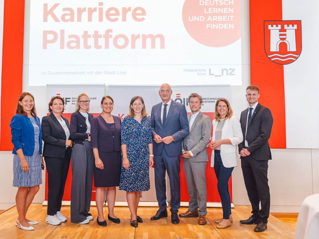 Brigitta Schmidsberger (Personaldirektorin Stadt Linz), Barbara Schalk-Steiner (ÖBB), Stefanie Wunsch (Post AG), Linzer Vizebürgermeisterin Tina Blöchl, Integrationsministerin Claudia Plakolm, Integrations- und Soziallandesrat in OÖ Dr. Christian Dörfel, ÖIF-Direktor Franz Wolf, Karin Probst (McDonalds) und Tobias Pramberger (AGRU).
