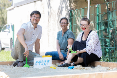 V.l.: Gregor Bayer, Geschäftsführung Soziale Initiative Gemeinnützige GmbH, Manuela Kasperek, Immobilienmanagement Soziale Initiative Gemeinnützige GmbH und Klimastadträtin Mag.a Eva Schobesberger im neu entsiegelten Innenhof.