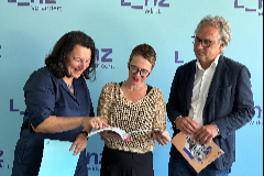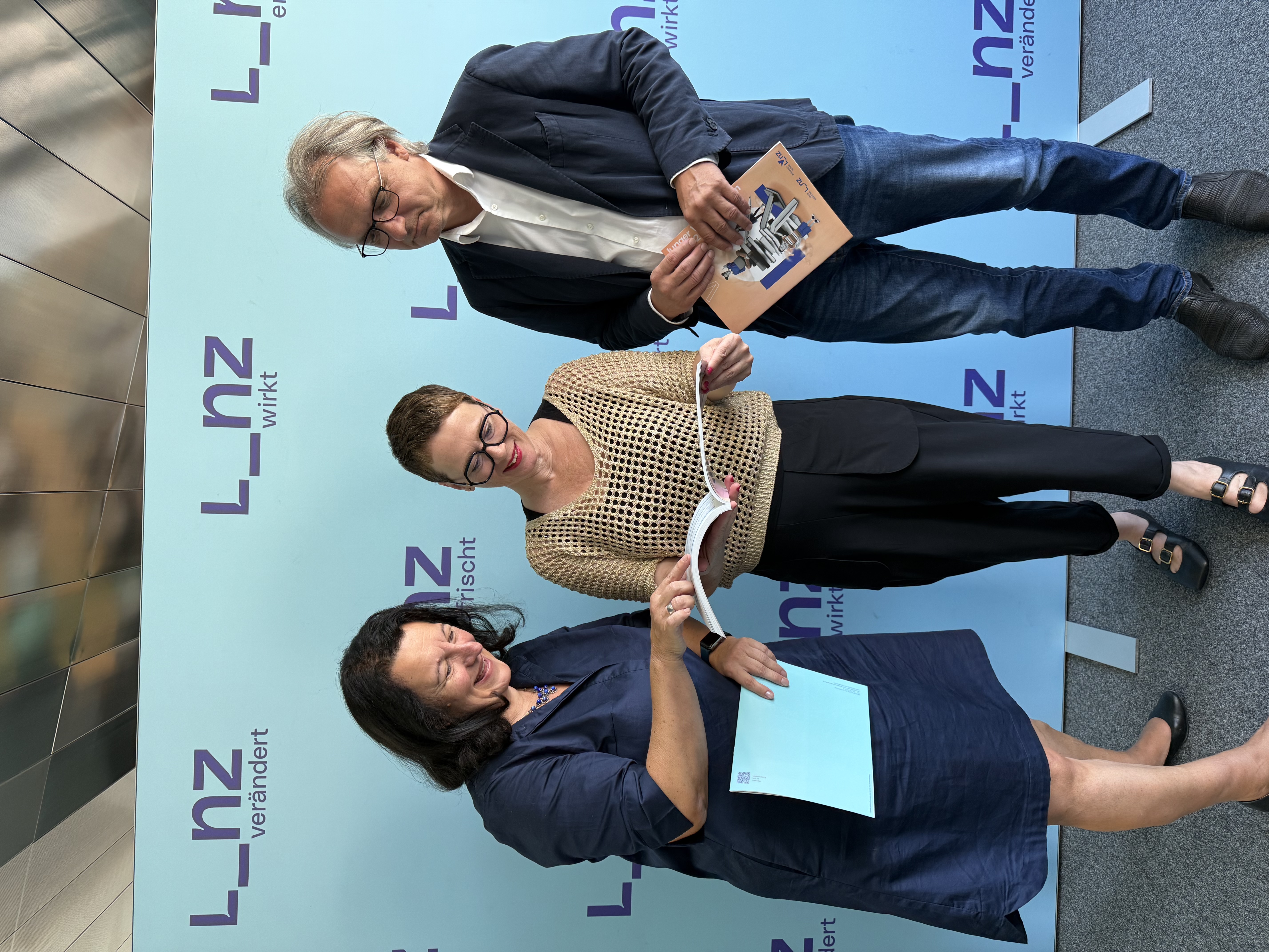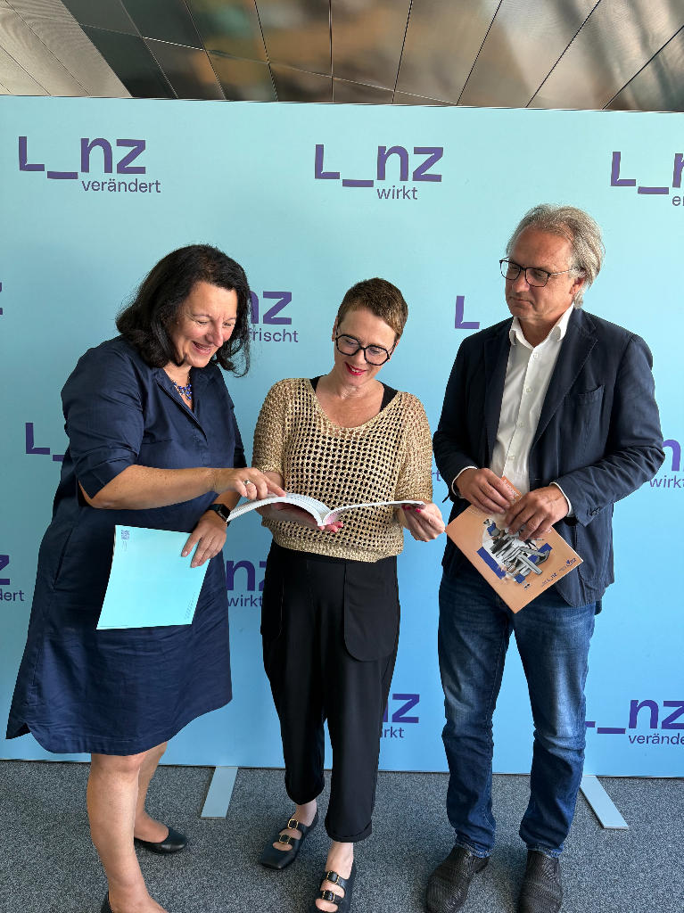 v.l.n.r.: Mag.a Katja Fischer, stellvertretende Abteilungsleiterin und Fachbereichsleiterin, Bildungsstadträtin Mag.a Eva Schobesberger und Kulturdirektor Dr. Julius Stieber präsentieren das neue Jahresprogramm 2025 / 26 der Volkshochschule Linz.