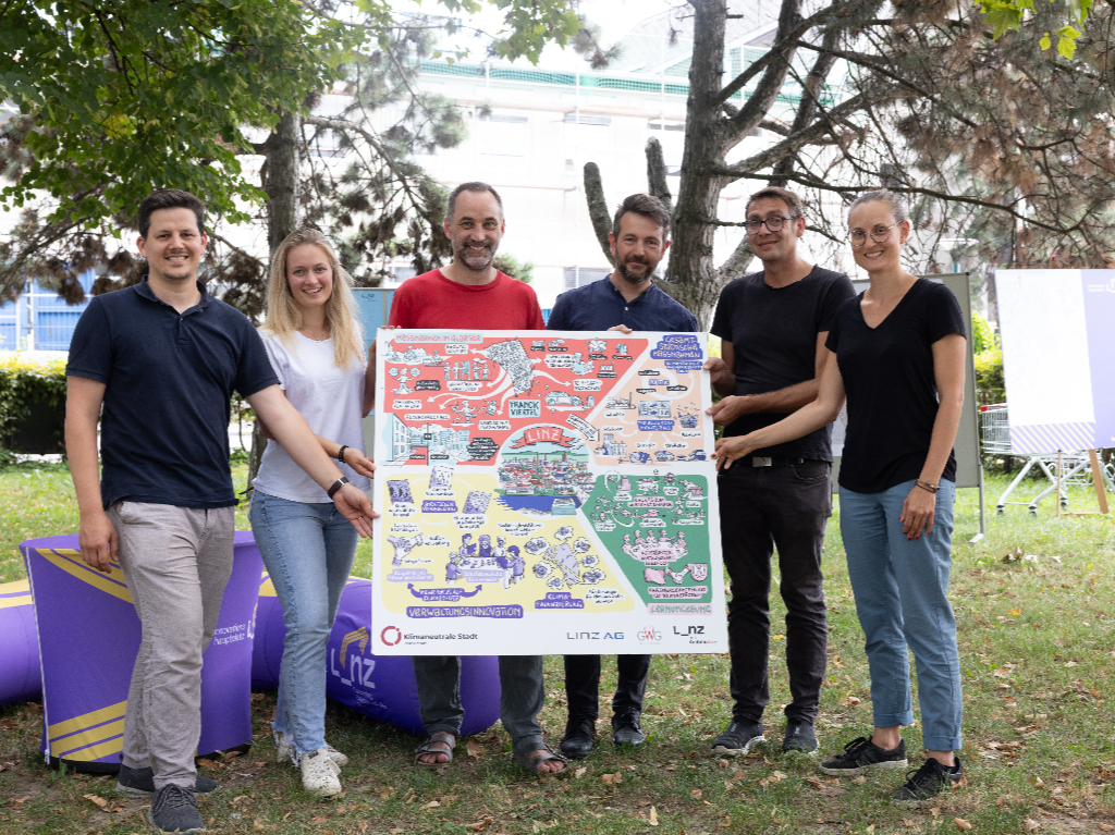 Das Pionierstadt-Team mit Martin Greiner (Geschäftsbereich Planung, Technik, Umwelt), Hanna Mayrhofer (Projektleiterin, WIKE, BSt), Gregor Lidauer (MPL, PTU), Gerald Schweitzer (Linz AG), Mario Panian (Linz AG), Sonja Bauernschuster (GWG)