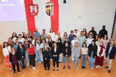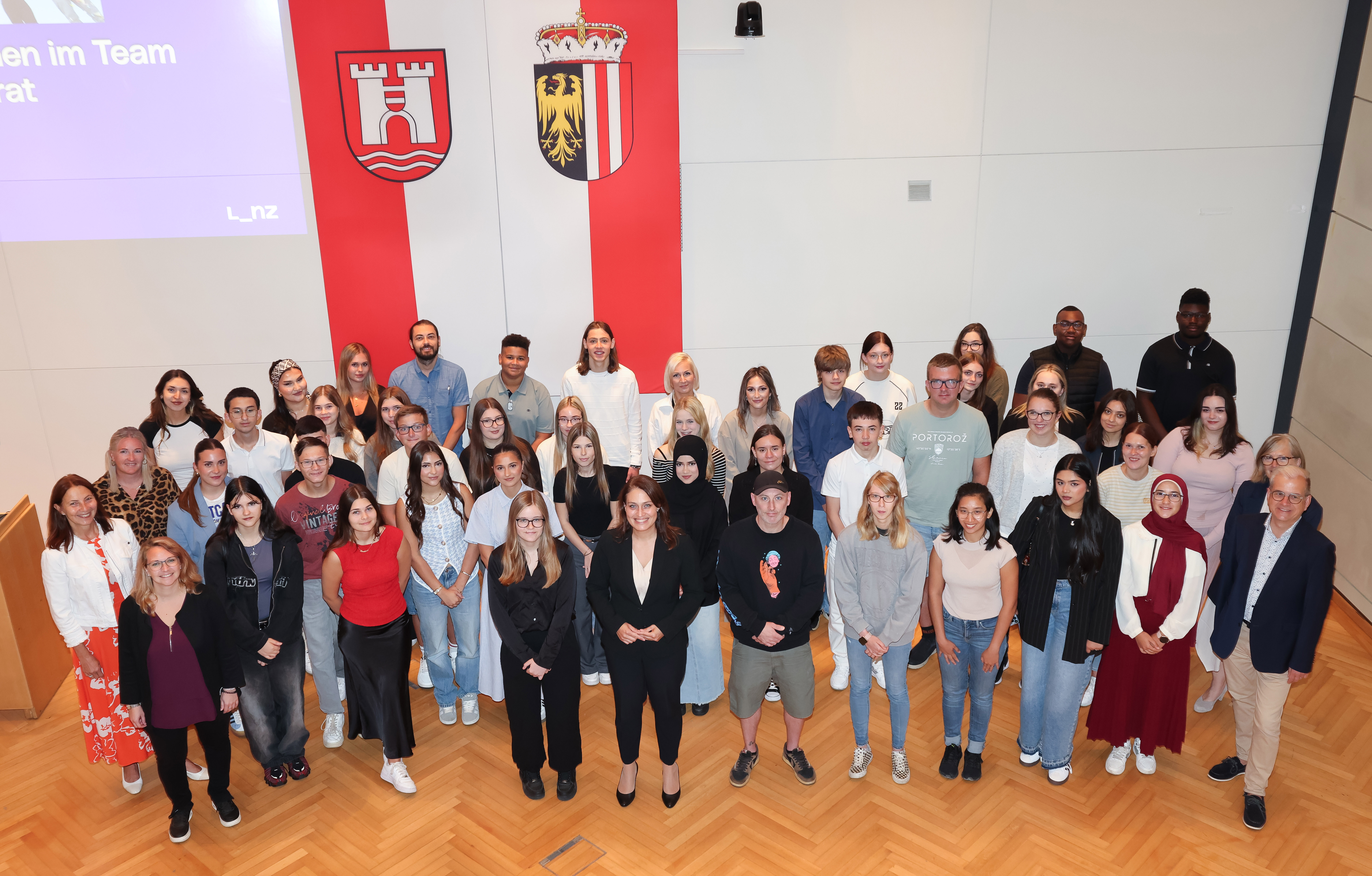 Vizebürgermeisterin Tina Blöchl (Mitte) und Personaldirektorin Mag.a Brigitta Schmidsberger (2. Reihe, links) begrüßten die neuen Lehrlinge im Alten Rathaus.