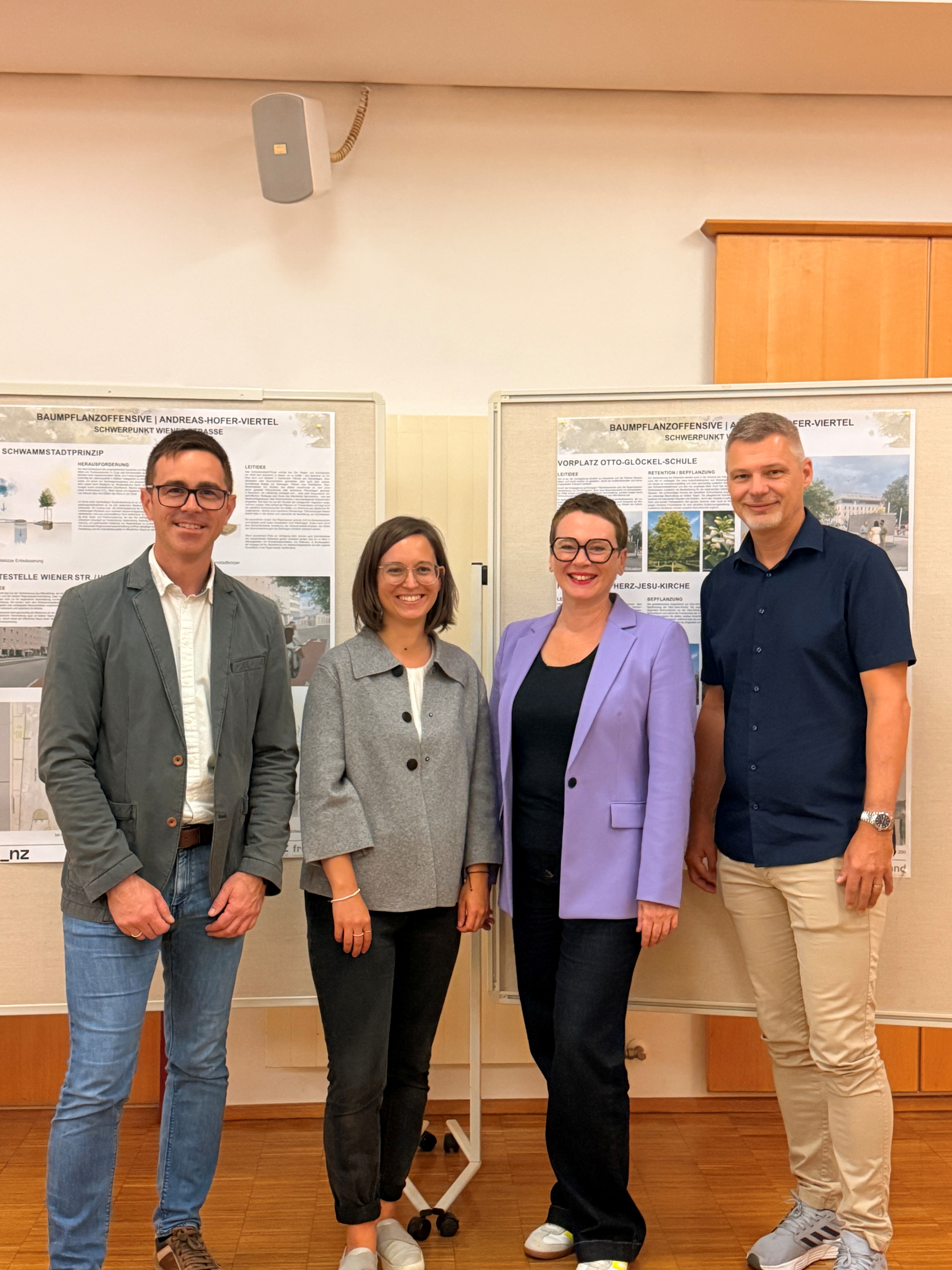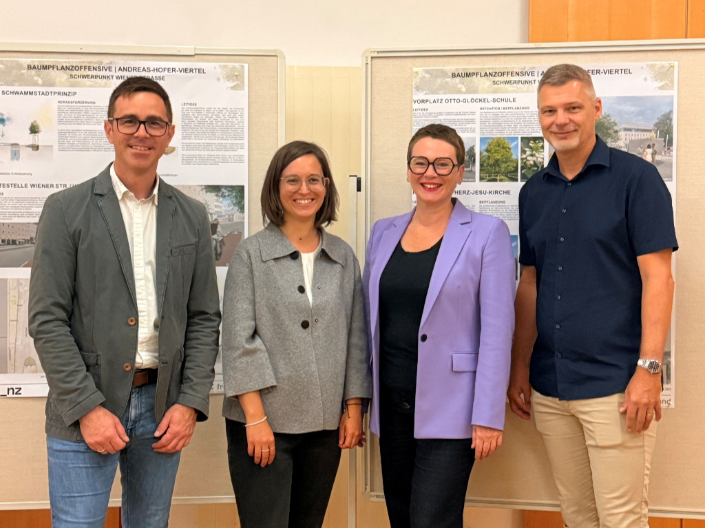 V.l.n.r.: Dipl.-Ing. (FH) Markus Pirngruber (Schimetta Consult ZT GmbH), DI.in Hannah Feichtinger (freiland Umweltconsulting ZT GmbH), Umweltstadträtin Mag.a Eva Schobesberger und Abteilungsleiter Stadtgrün und Straßenbetreuung Ing. Peter Perlinger