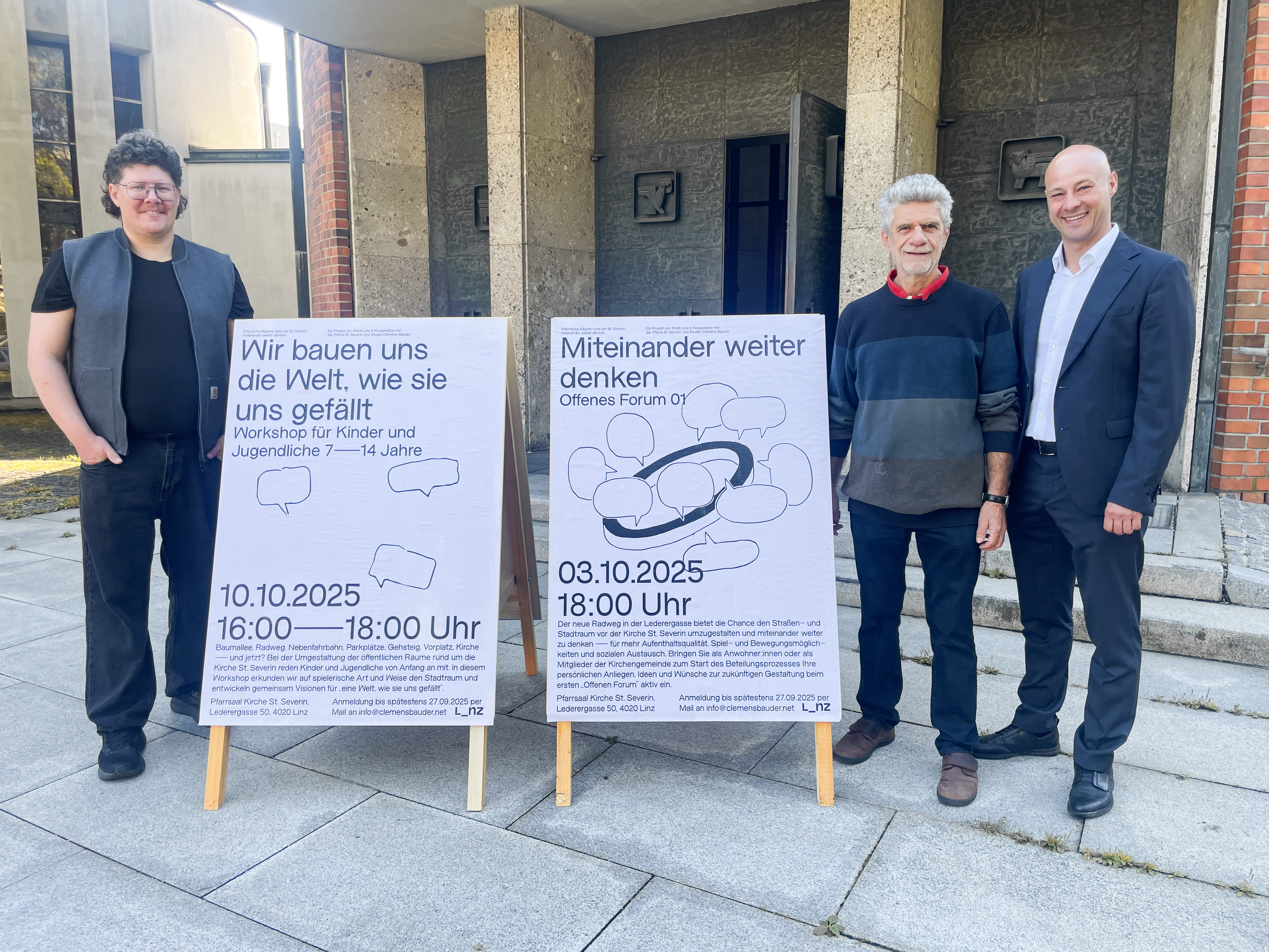 Mobilitätsreferent Vizebürgermeister Mag. Martin Hajart (re.) lädt gemeinsam mit dem Leiter des Seelsorgeteams St. Severin, Dr. Helmut Wagner (Mitte), und Clemens Bauder zum Offenen Forum für Interessierte und zum Workshop für Kinder und Jugendliche.