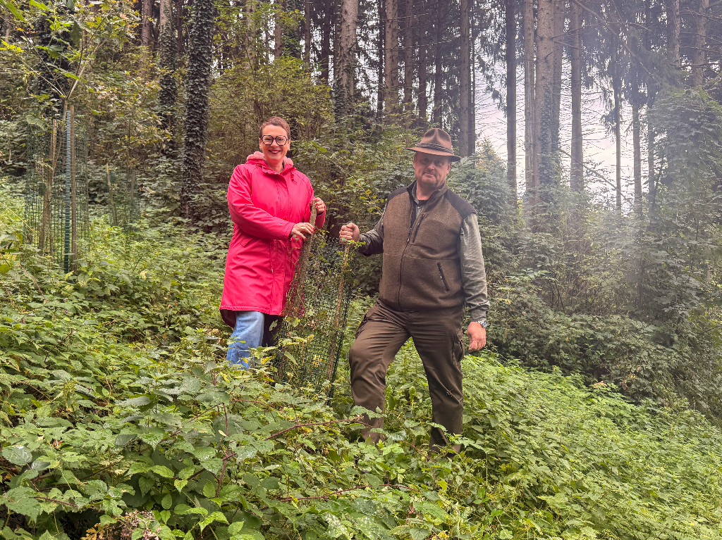Im Süden und Norden von Linz, wie hier am Rande des Haselgrabens in Urfahr, wurden zahlreiche Bäume neu gesetzt. Klimastadträtin Mag.a Eva Schobesberger und Stadtörster Ing. Rudolf Horner überzeugen sich vom guten Wachstum der neu gesetzten Forstpflanzen.