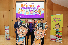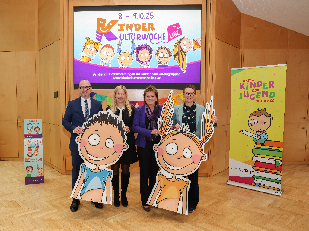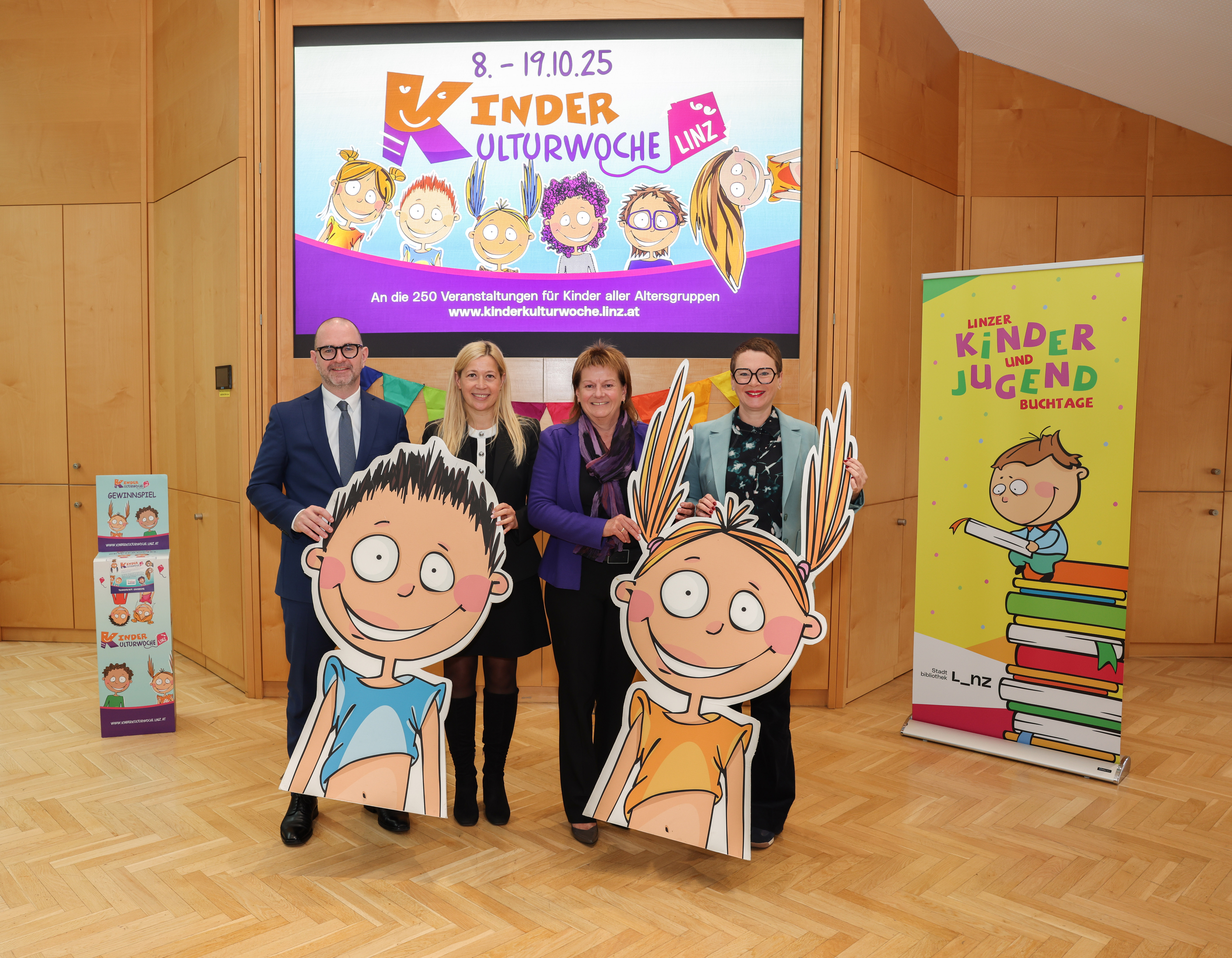 Bürgermeister Dietmar Prammer, Kulturreferentin Stadträtin Doris Lang-Mayerhofer, Sozialreferentin Vizebürgermeisterin Karin Hörzing und Bildungsreferentin Stadträtin Mag.a Eva Schobesberger präsentieren das Programm der 13. Kinderkulturwoche Linz.