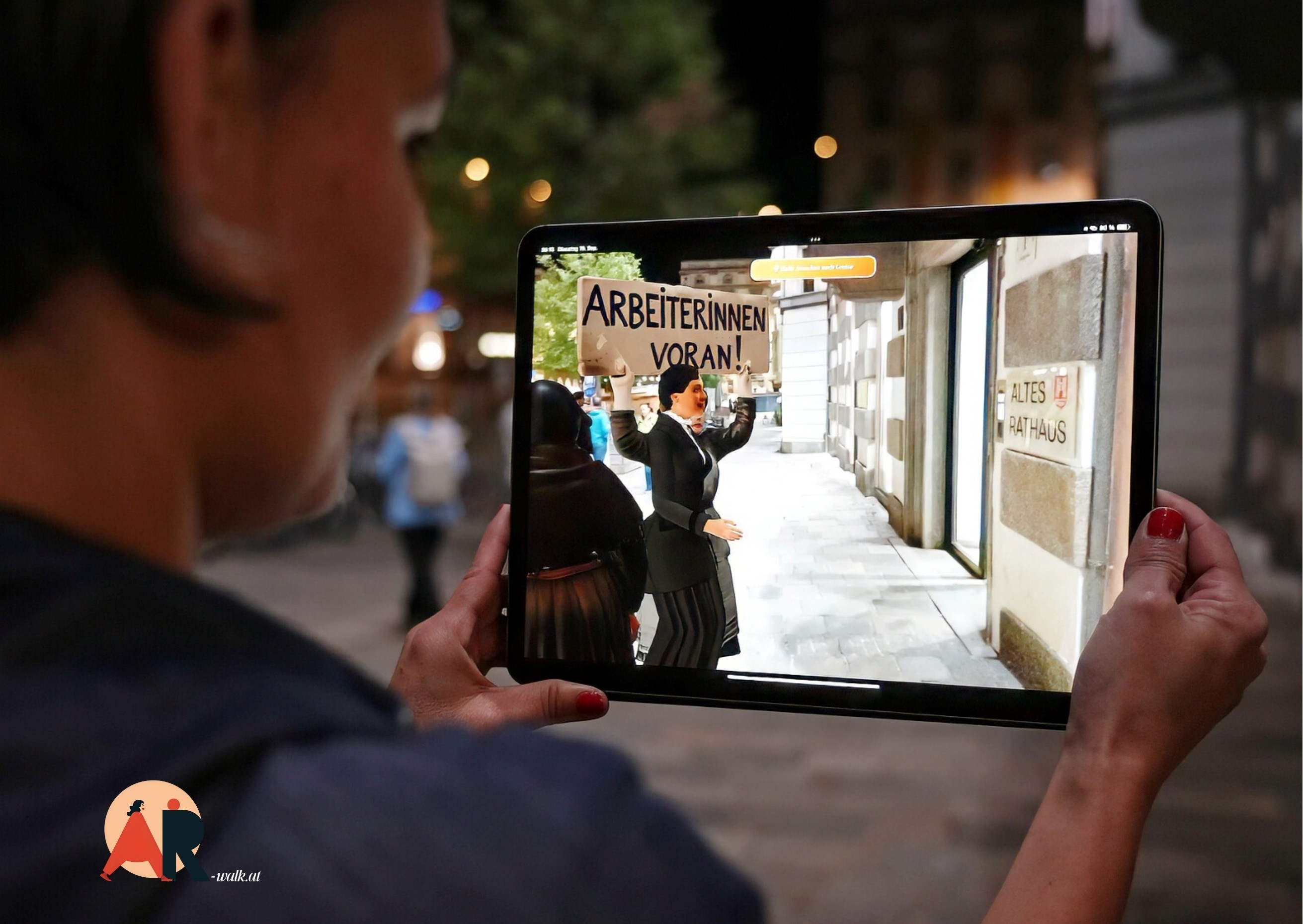 Sie sind herzlich eingeladen den AR-Walk am 7. Oktober vor dem Alten Rathaus auszuprobieren - mit dem eigenen Smartphone oder einem der bereitgestellten Tablets vor Ort: