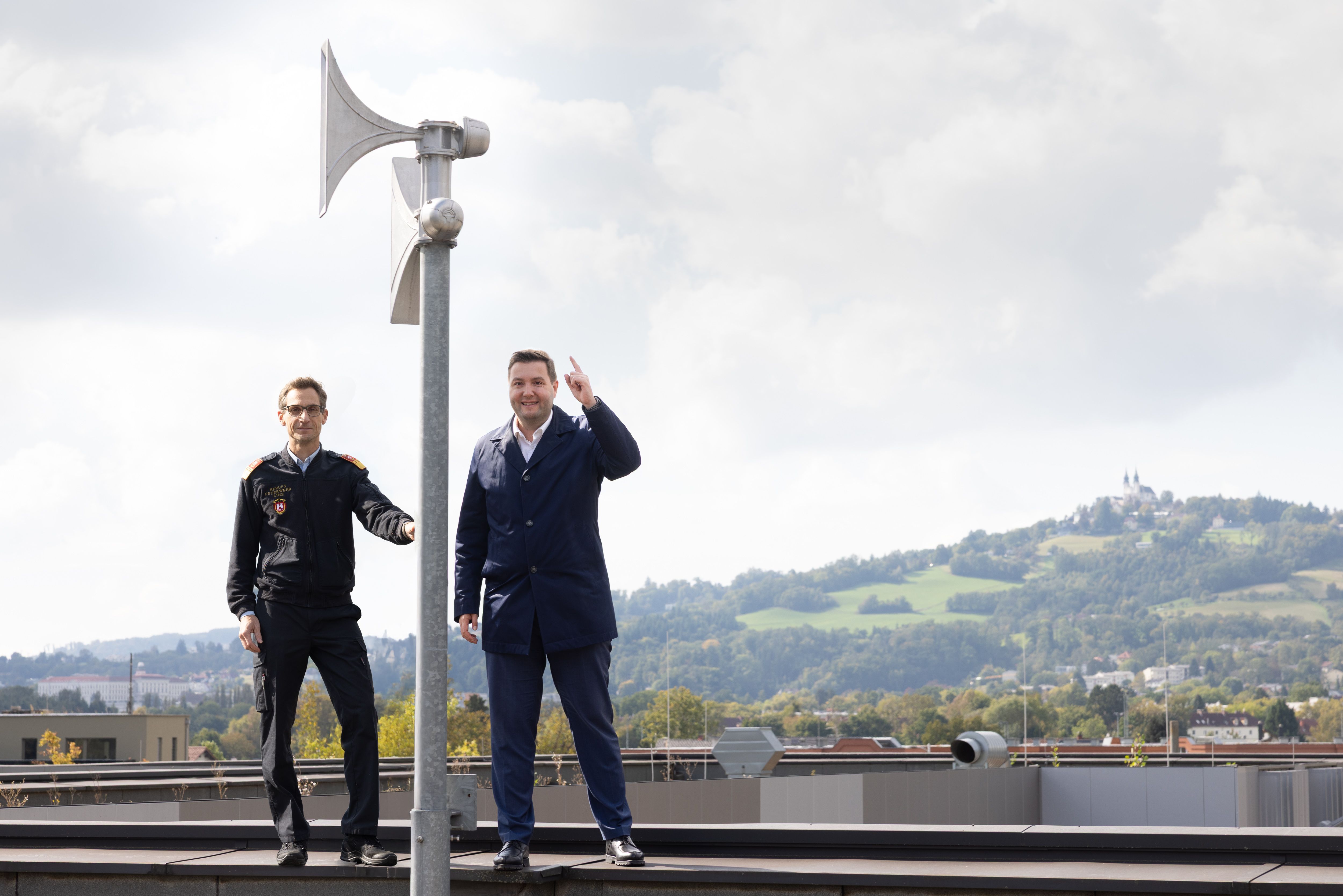 Branddirektor DI Stefan Krausbar (l.) und Sicherheitsstadtrat Dr. Michael Raml machen auf die bundesweite Zivilschutz-Probealarm aufmerksam