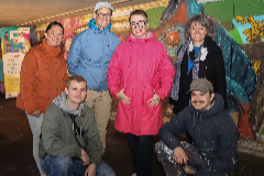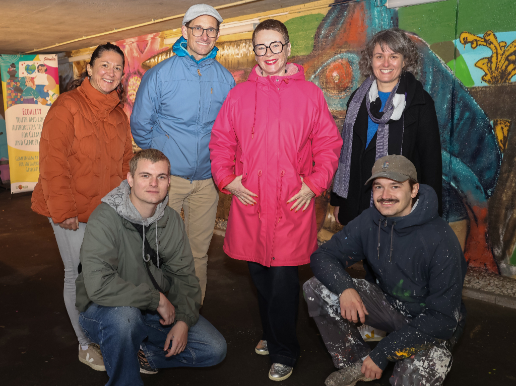 Lisa Aigelsperger (Südwind), David Eichinger (Ramsauer Gymnasium), Stadträtin Mag.a Eva Schobesberger und Anna Riebe-Maybach (Ramsauer Gymnasium) (von links nach rechts) Moritz Danner und Mario Moder von der Kunstuni Linz (vorne)