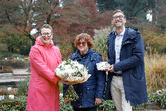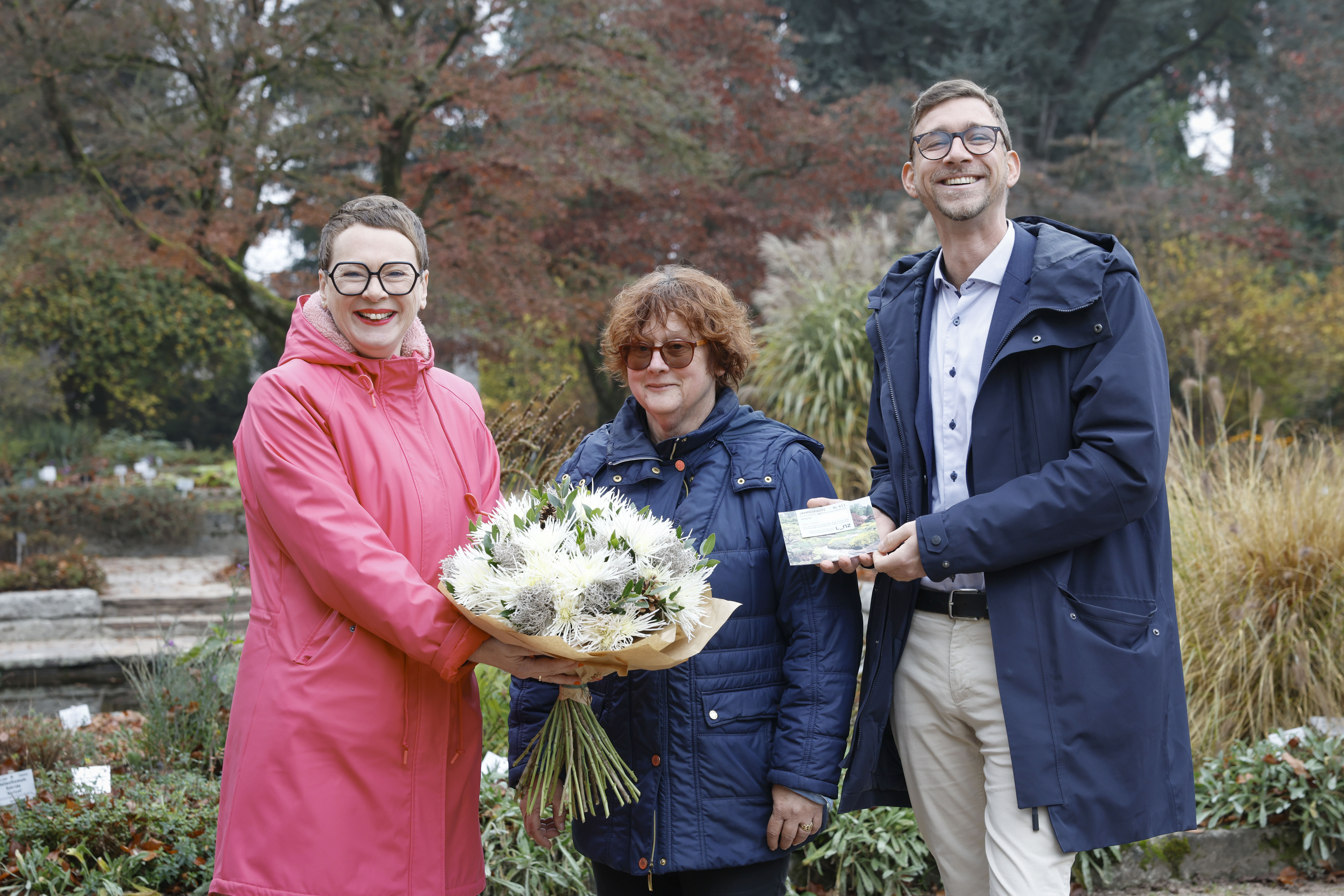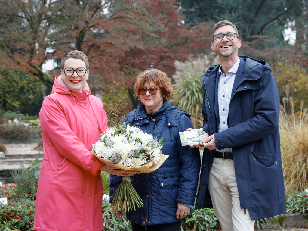 Grünreferentin Stadträtin Mag.a Eva Schobesberger (li) und Thomas Schiefecker MSc (Leiter des Botanischen Gartens, re) überreichten der 100.000sten Besucherin Martina Martin (Mitte) eine Jahreskarte und einen Blumenstrauß aus der Stadtgärtnerei.