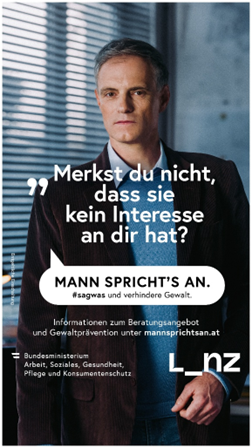 Die Kampagne „#sagwas – Mann spricht's an“ des Sozialministeriums macht bereits seit 2021 auf dieses Thema aufmerksam. Sie wurde bereits mehrfach ausgezeichnet. „#sagwas – Mann spricht’s an“ soll vor allem Männer ermutigen einzuschreiten, wenn sie Zeugen von Gewalt gegen Frauen werden. Sie adressiert daher direkt die Verantwortung von Männern – und zwar nicht als Täter, sondern als jene, die einschreiten können, wenn sie Übergriffe mitbekommen.
