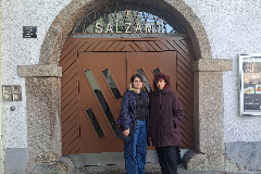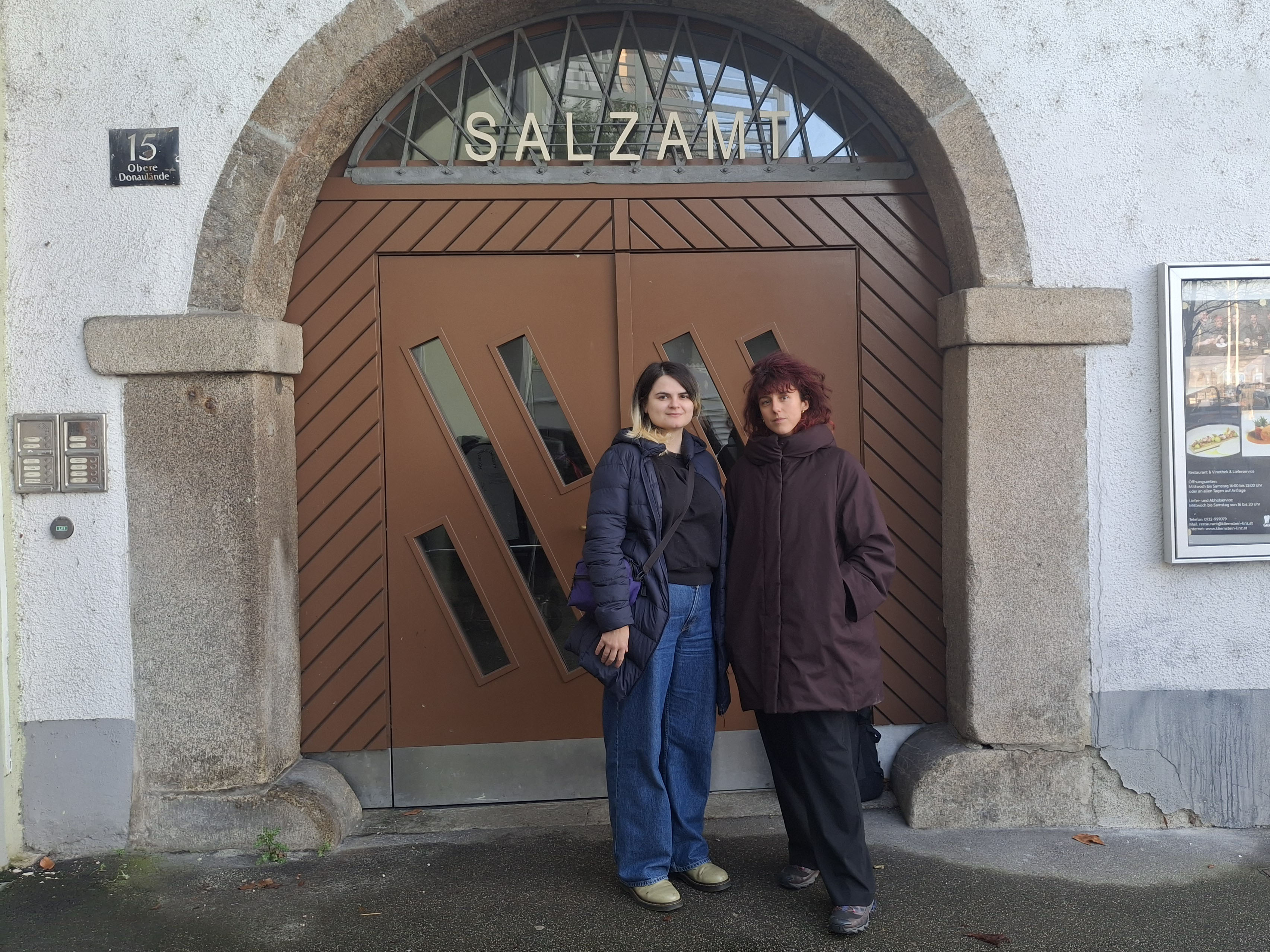 Die Künstlerinnen Olia Fedorova (links) und Éléa-Jeanne Schmitter (rechts) vor dem Eingangstor zum Atelierhaus an der Oberen Donaulände.
