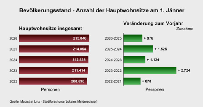 215.040 Hauptwohnsitze zählt die Stadt Linz mit Stand 1. Jänner 2026. Dies besagt die aktuelle Analyse der Linzer Stadtforschung. Das entspricht im Vergleich zum 1. Jänner 2025 einer Zunahme um exakt 976 Personen. Der Zuwachs im Jahr 2025 war damit deutlich geringer als 2024. Damals wurde ein Plus von 1.526 Personen verzeichnet.